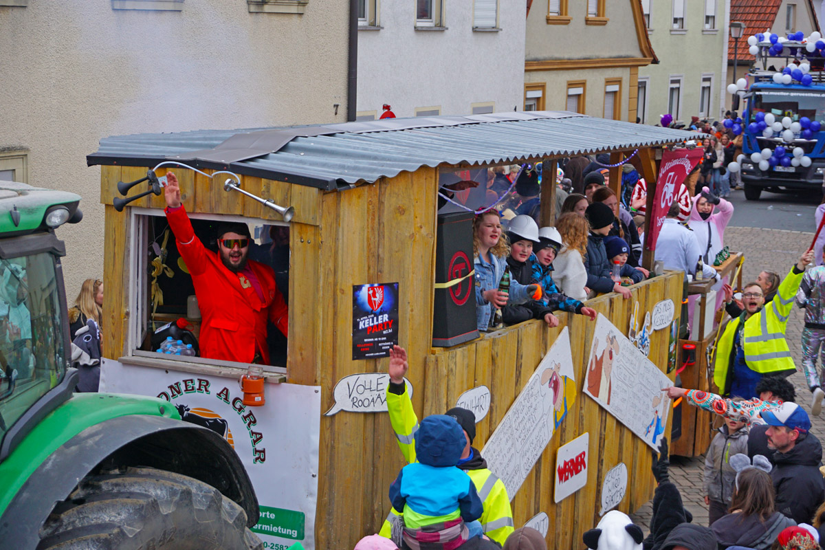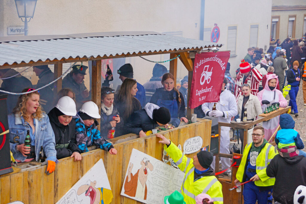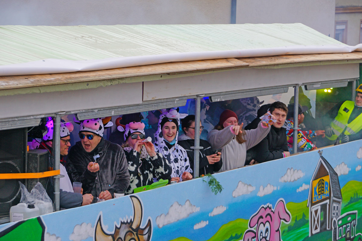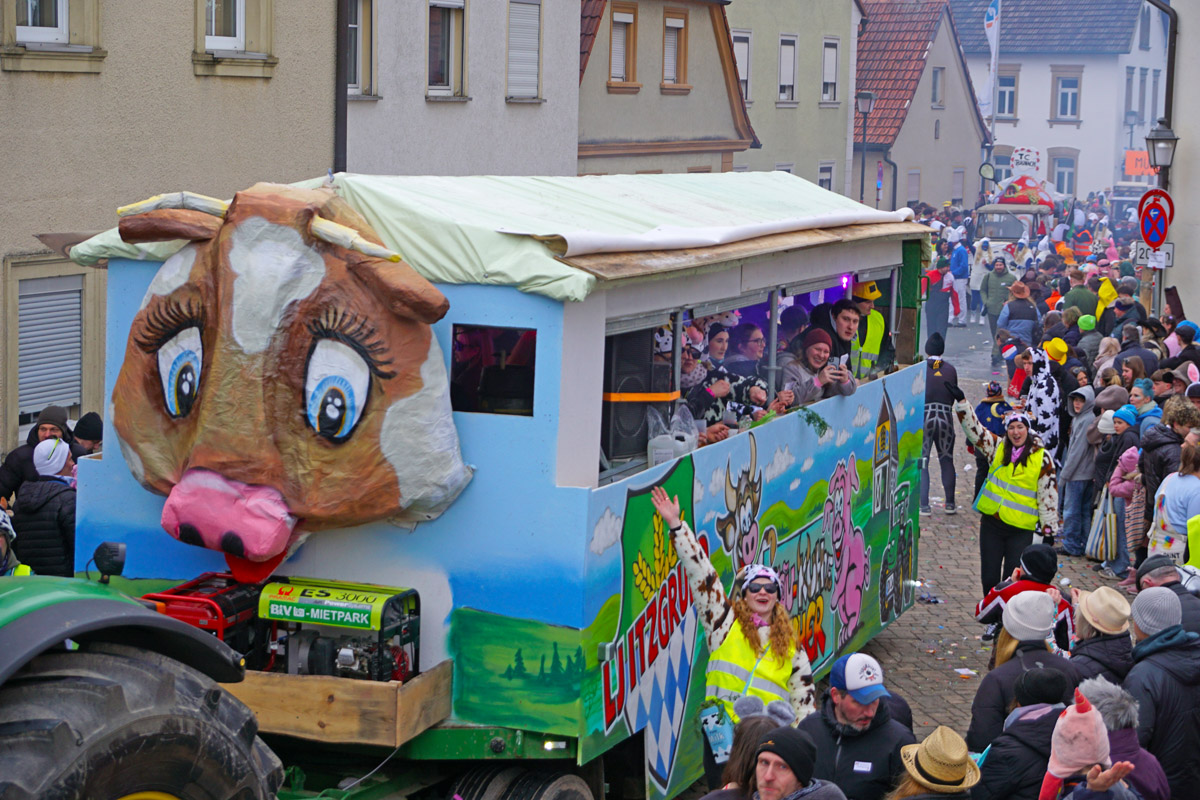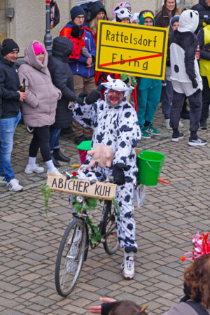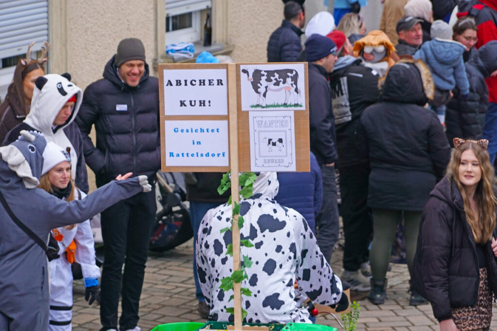 „Rattelsdorf: Buff Dull!“ Erneut klang der altbekannte Rattelsdorfer Faschingsruf quer über den Marktplatz – zuerst, als der St. Michaelsverein Werbung für seinen Bratwurst- und Bierstand machte, und dann, als Moderator Franz Schilling die teilnehmenden Gruppen begrüßte, vorstellte und auf einen tollen Umzug einstimmte. Angeführt wurde der 17. Faschingsumzug in Rattelsdorf vom Wagen der Gemeinde, wobei: Vorgedrängt hatte sich der „Underground-Bürgermeister“, wie ihn Schilling vorstellte. Verkleidet als Kuh fuhr Christian Hamann voraus und tauchte auch zwischendurch immer wieder am Marktplatz auf.