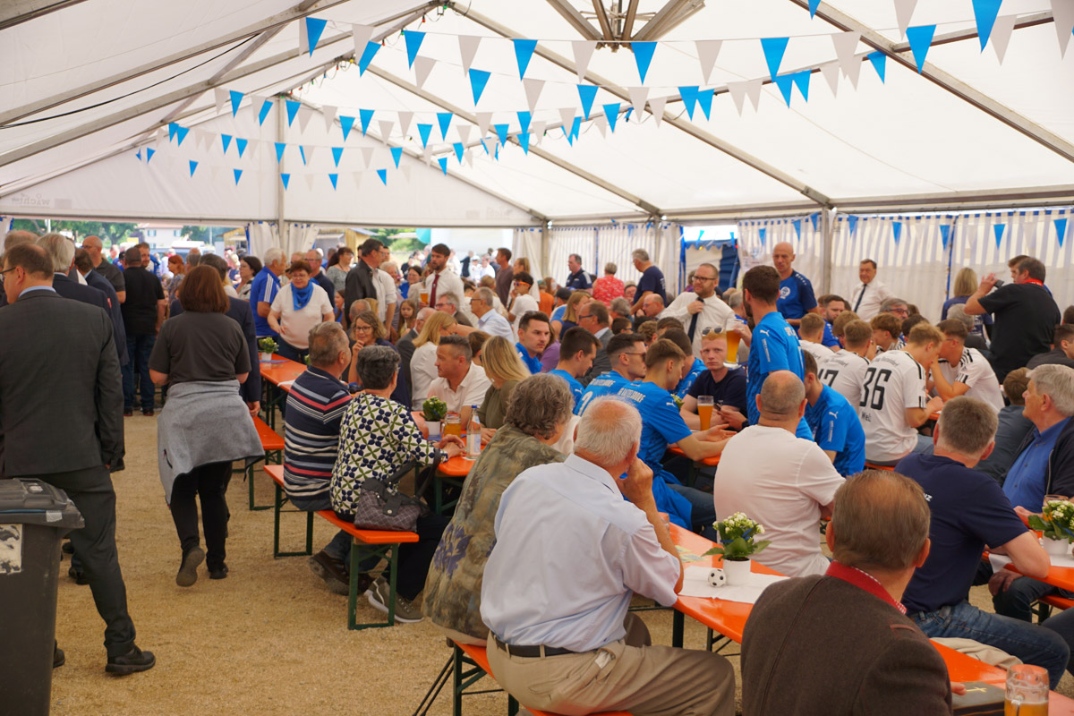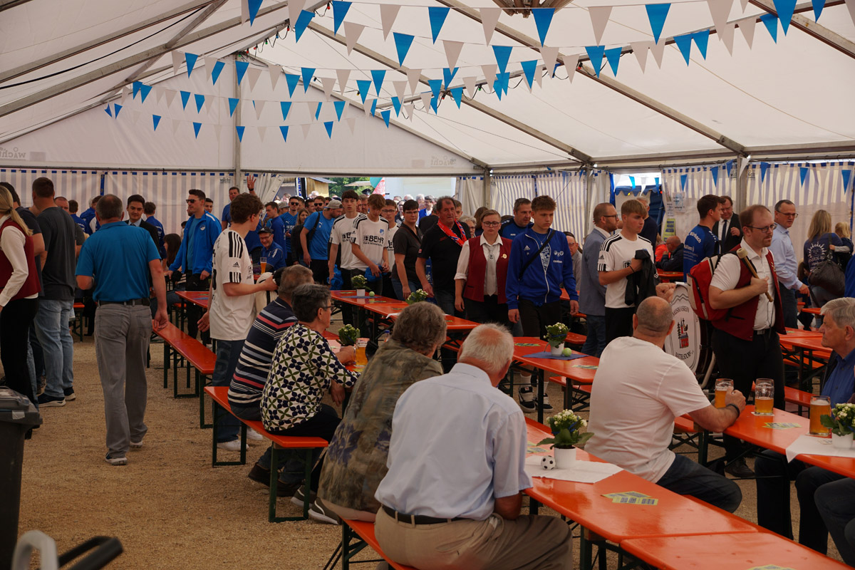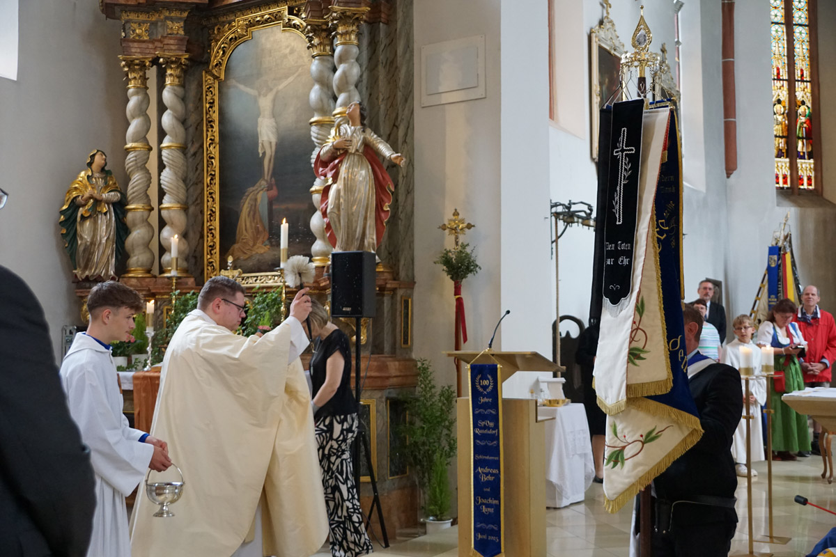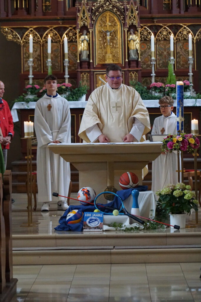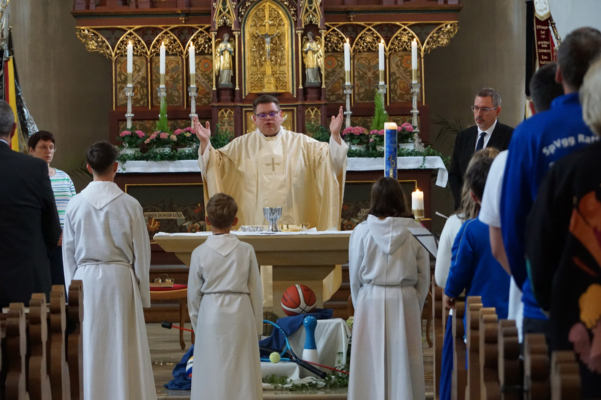 Im Gottesdienst weihte Pfarrer Philipp Janek ein neues Fahnenband und gratulierte dem Verein zu seinem großen Jubiläum. Die Gemeinschaft aus über 800 Mitgliedern funktioniere nur, weil es Regeln gibt. „Im Sport steht eigentlich nicht im Vordergrund, einen Sieger zu küren, sondern gemeinsam zu wachsen“, so Janek. Erst die Regeln ermöglichten das Miteinander und den Erfolg. „In dieser Hinsicht sind sich Sportvereinigung und Kirche sehr ähnlich, da es nicht darum geht, für Einzelne etwas hervorzubringen, sondern die persönlichen Entwicklung und so ein glückliches Leben für alle zu fördern.“