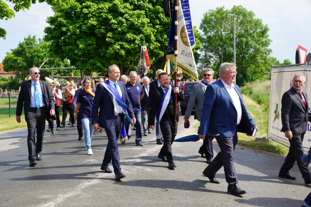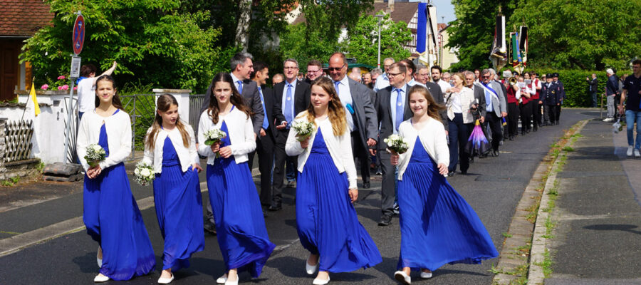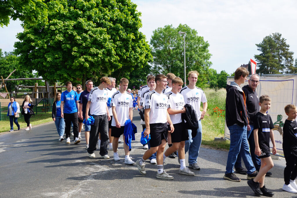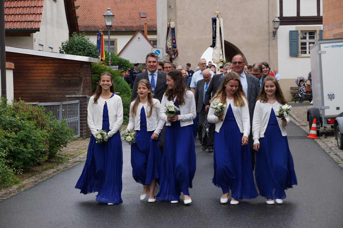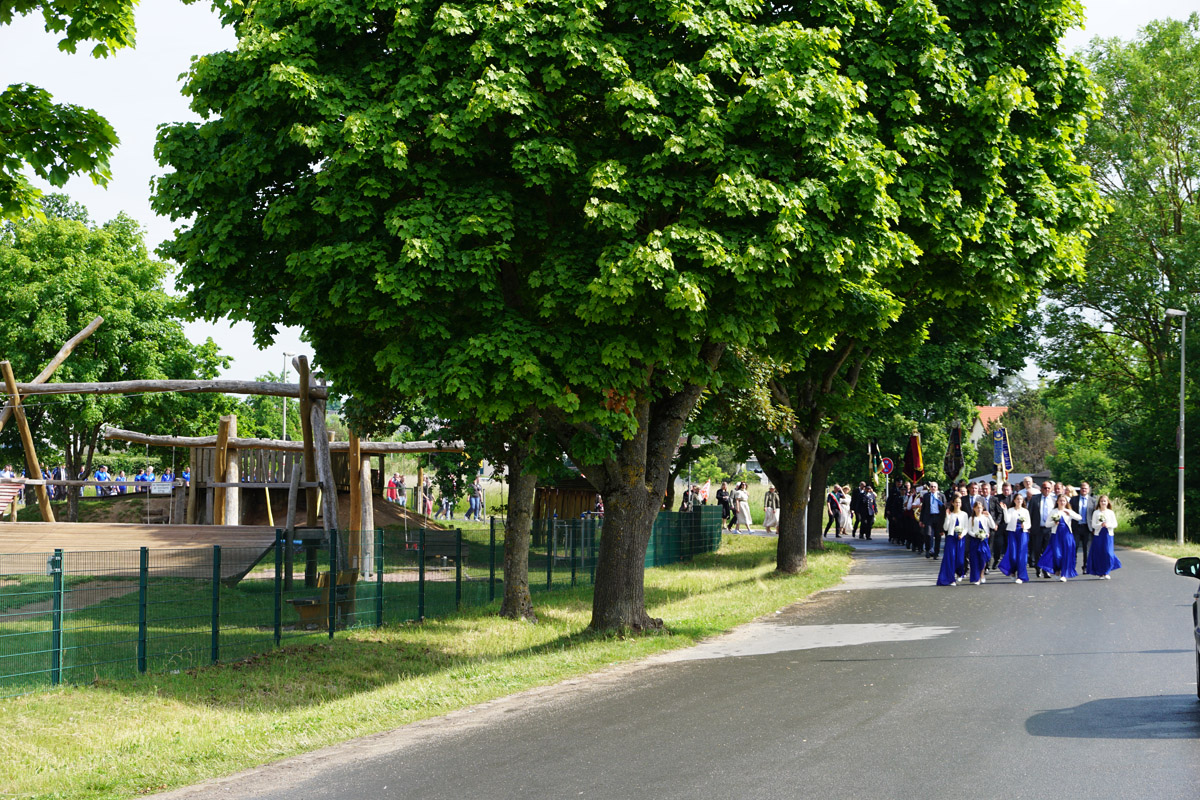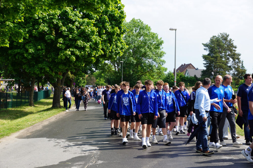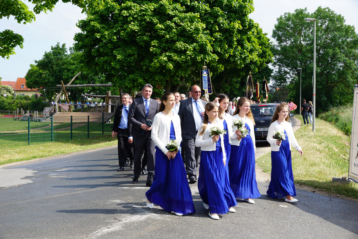 Kurz vor dem Start des Festumzugs nach dem Gottesdienst sagte der leichte Regen „Auf Wiedersehen“ – und die zahlreichen Teilnehmerinnen und Teilnehmer konnten trockenen Fußes von der Kirche durchs Torhaus bis zum Sportplatz laufen.