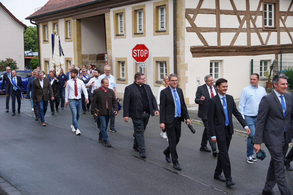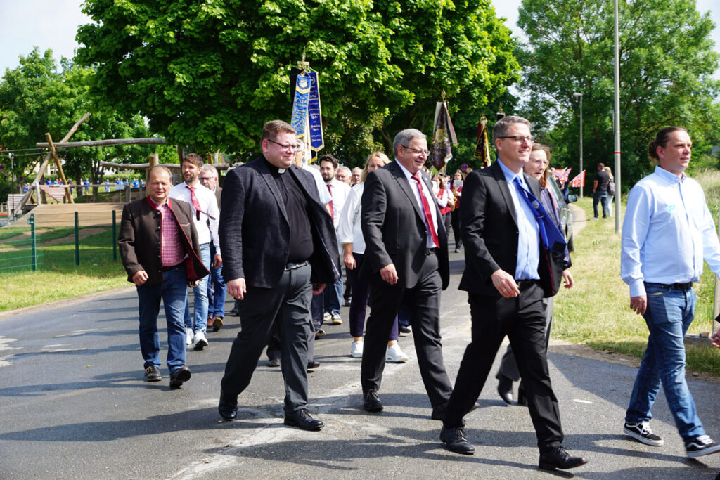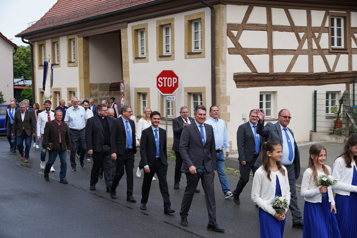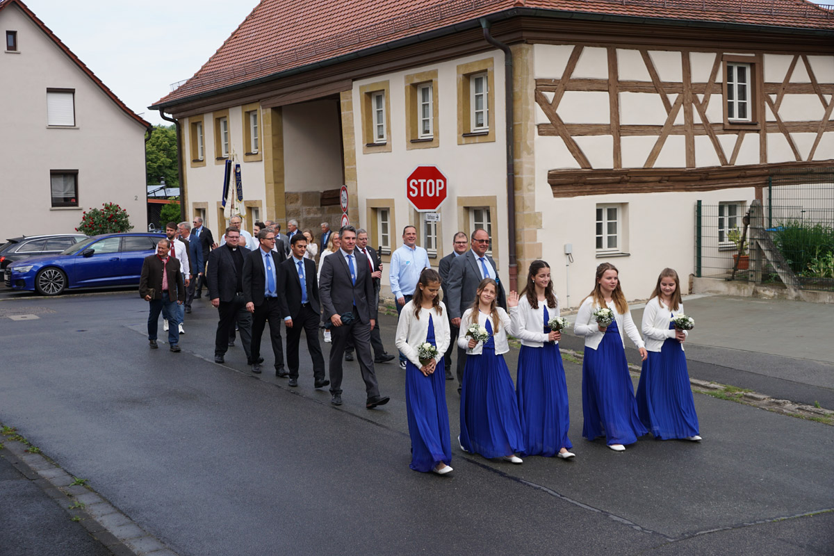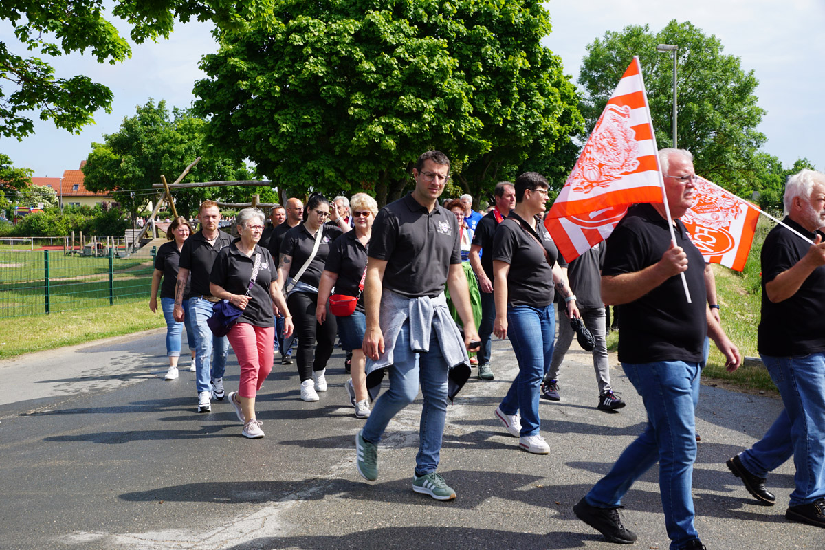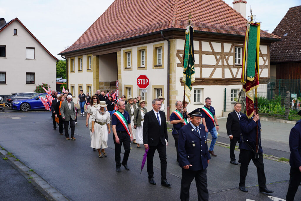 Kurz vor dem Start des Festumzugs nach dem Gottesdienst sagte der leichte Regen „Auf Wiedersehen“ – und die zahlreichen Teilnehmerinnen und Teilnehmer konnten trockenen Fußes von der Kirche durchs Torhaus bis zum Sportplatz laufen.