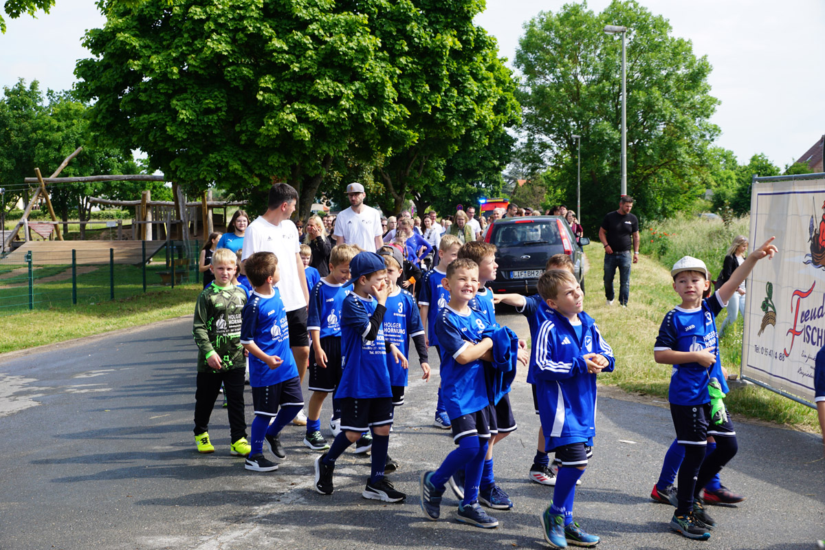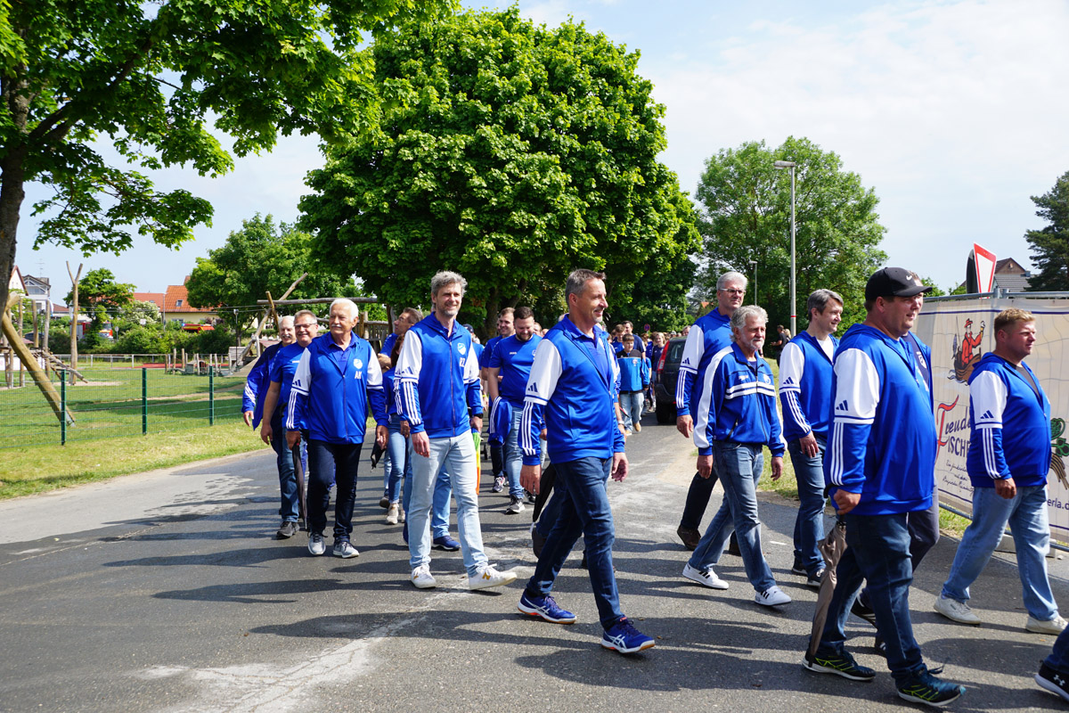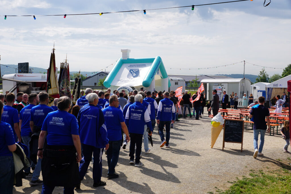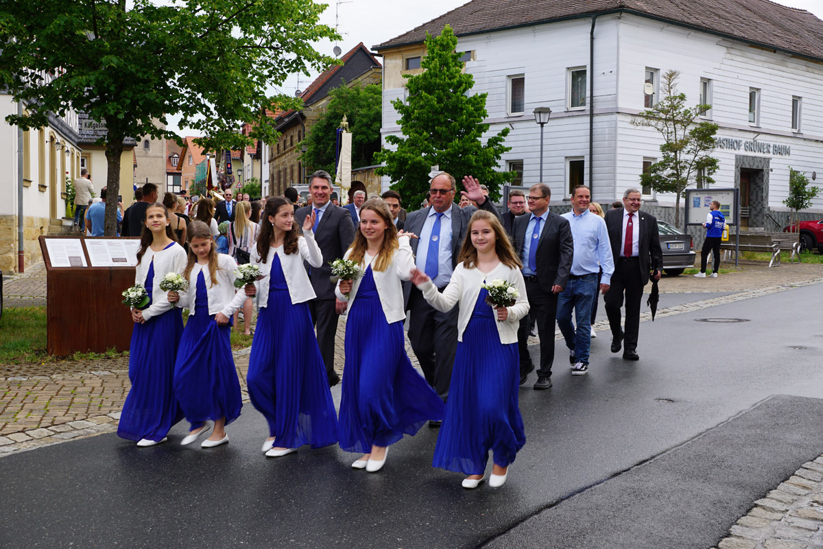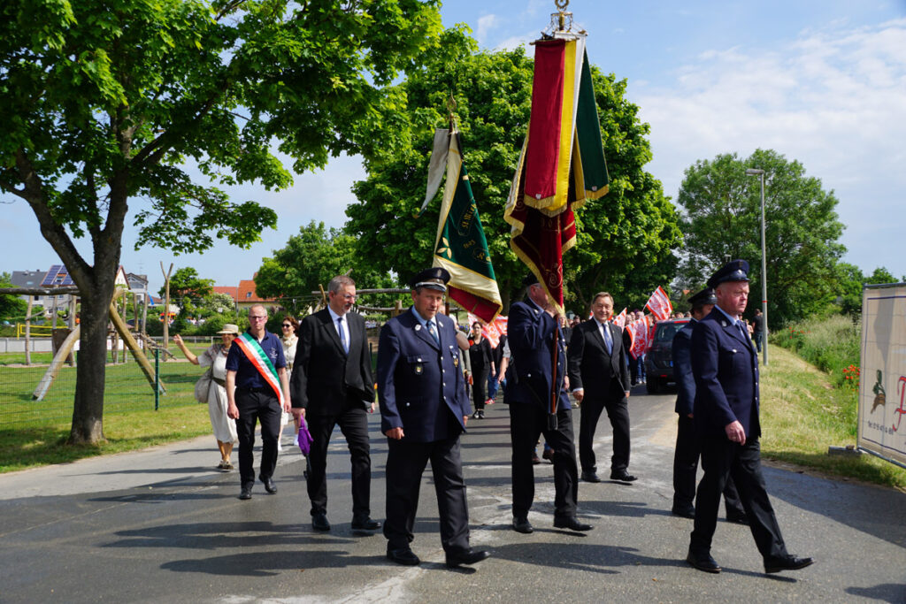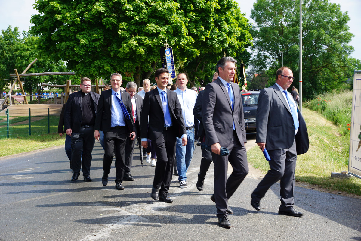 Kurz vor dem Start des Festumzugs nach dem Gottesdienst sagte der leichte Regen „Auf Wiedersehen“ – und die zahlreichen Teilnehmerinnen und Teilnehmer konnten trockenen Fußes von der Kirche durchs Torhaus bis zum Sportplatz laufen.