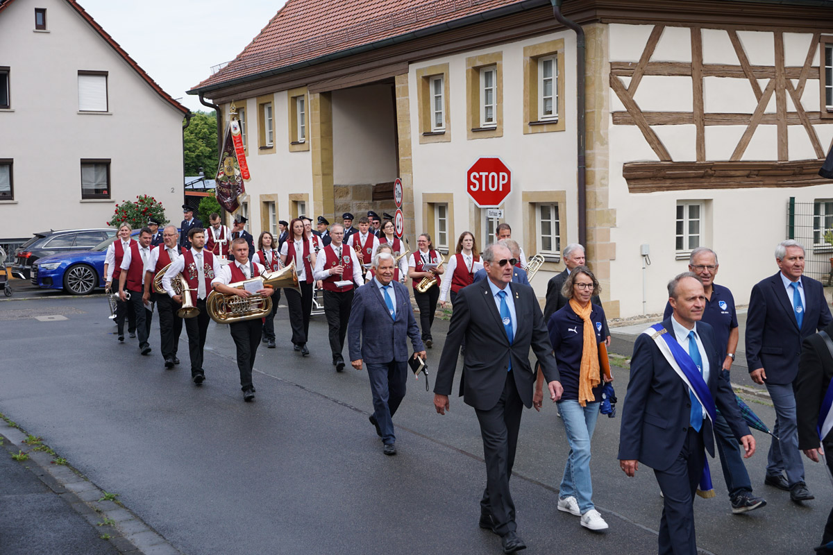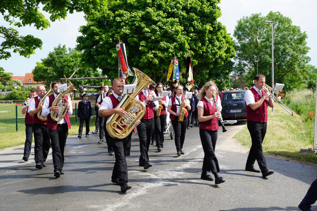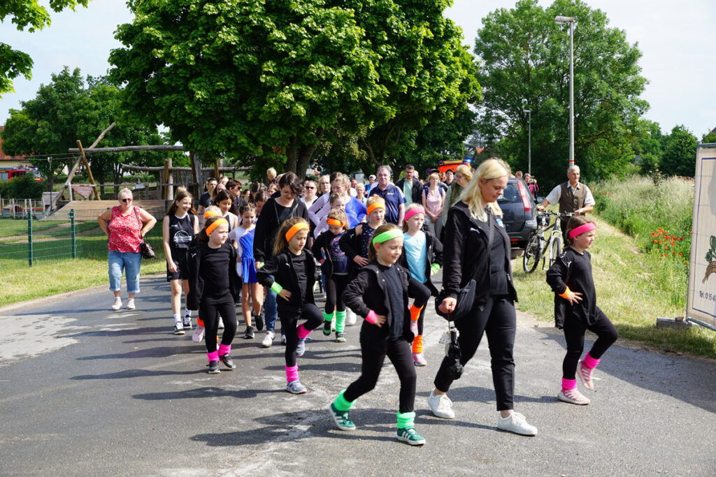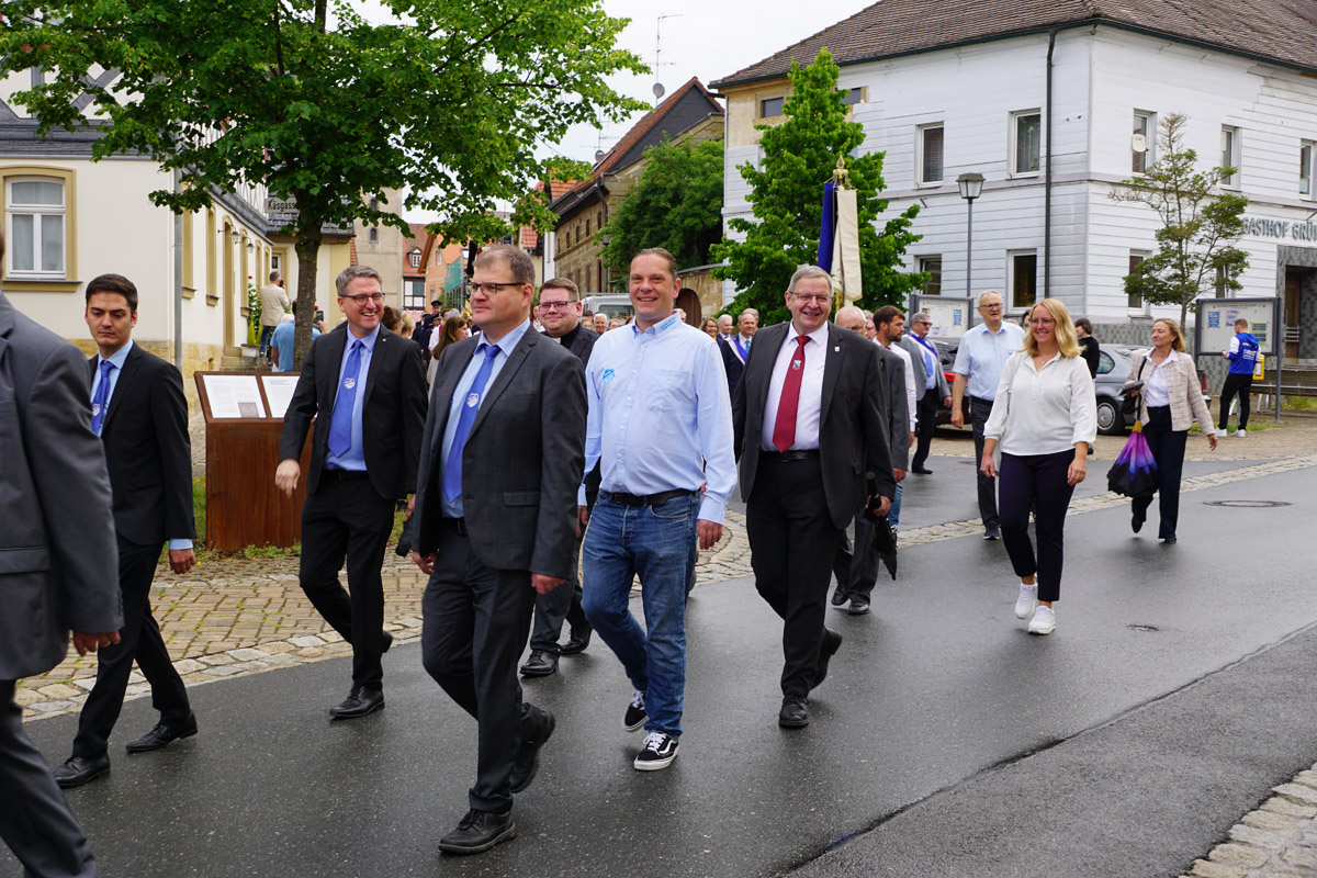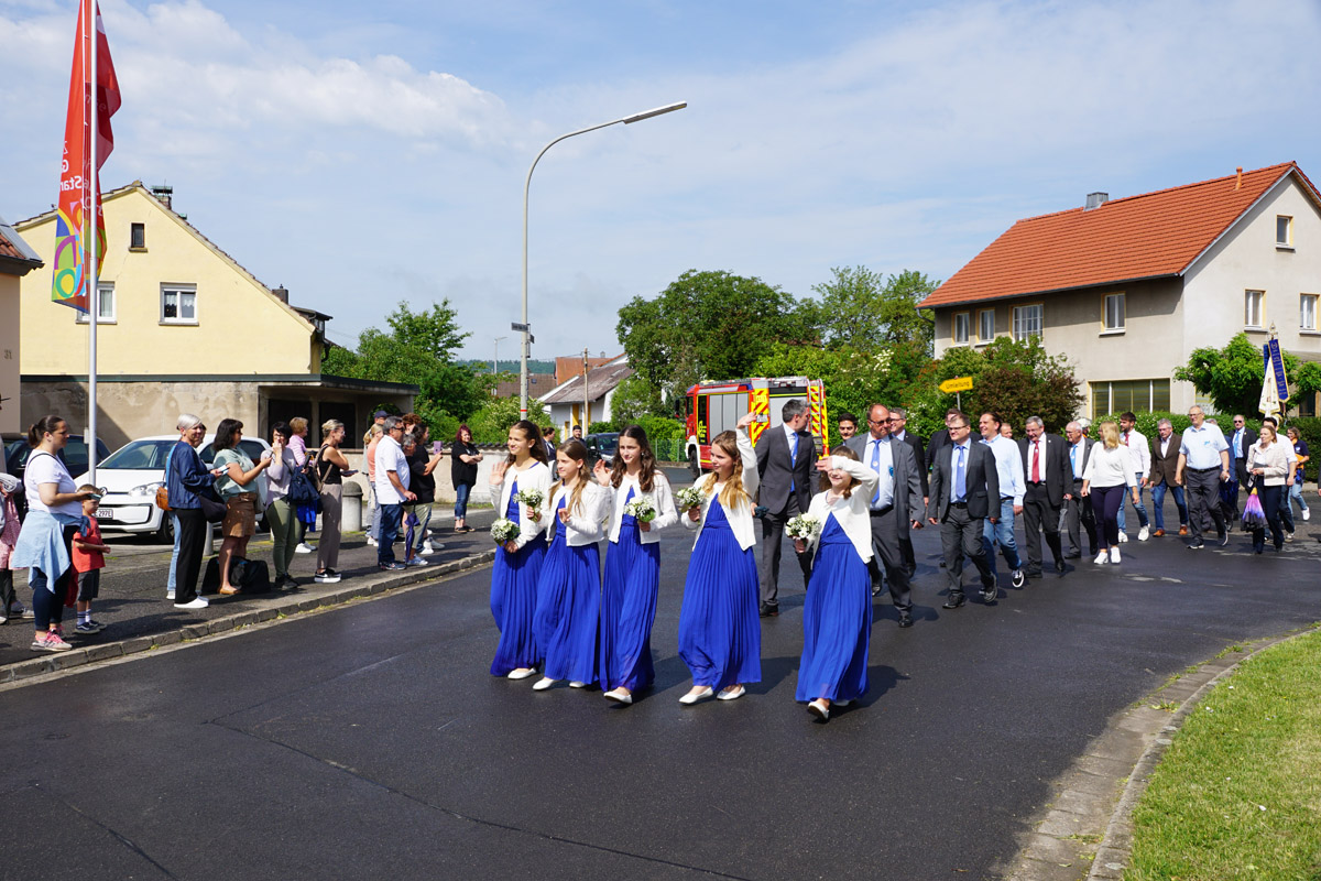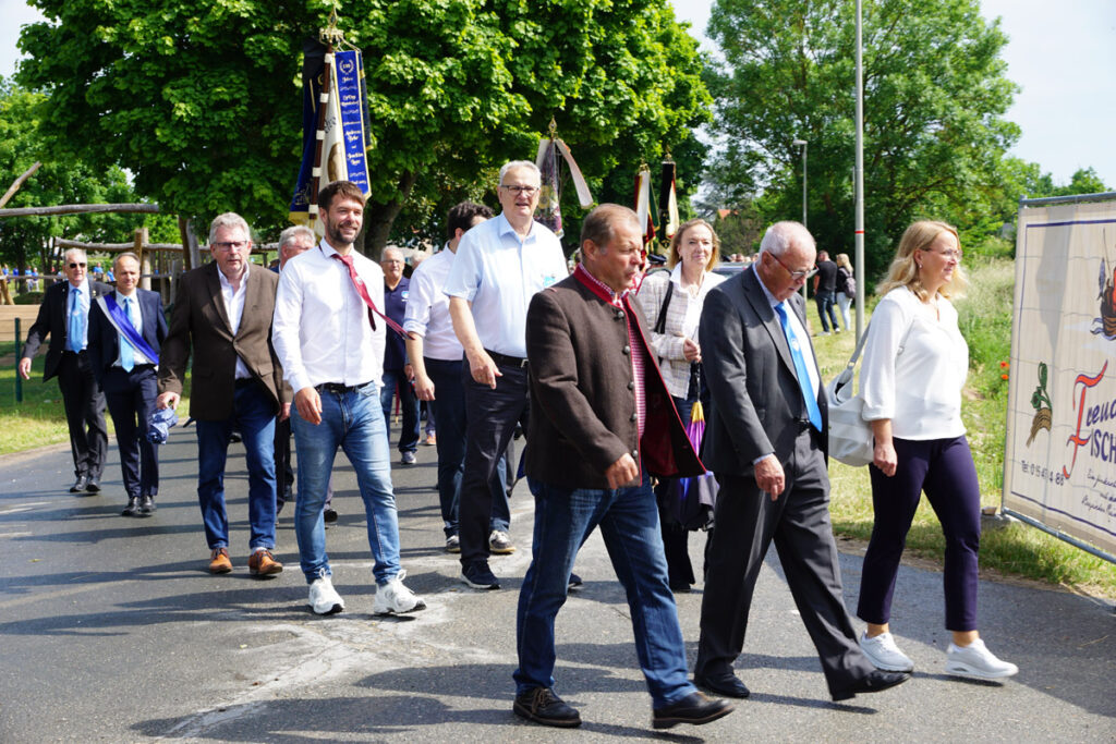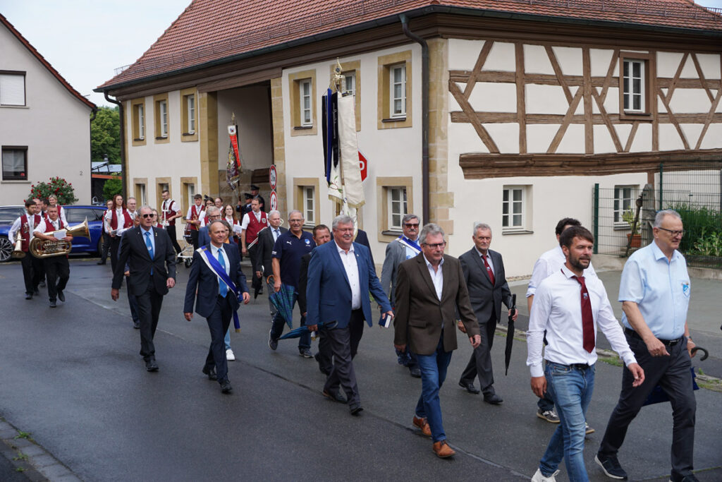 Kurz vor dem Start des Festumzugs nach dem Gottesdienst sagte der leichte Regen „Auf Wiedersehen“ – und die zahlreichen Teilnehmerinnen und Teilnehmer konnten trockenen Fußes von der Kirche durchs Torhaus bis zum Sportplatz laufen.