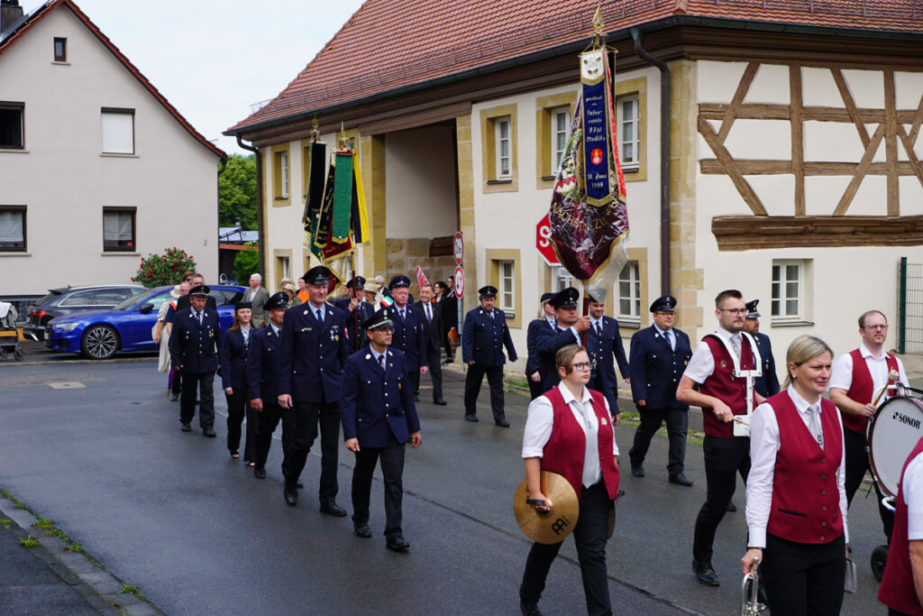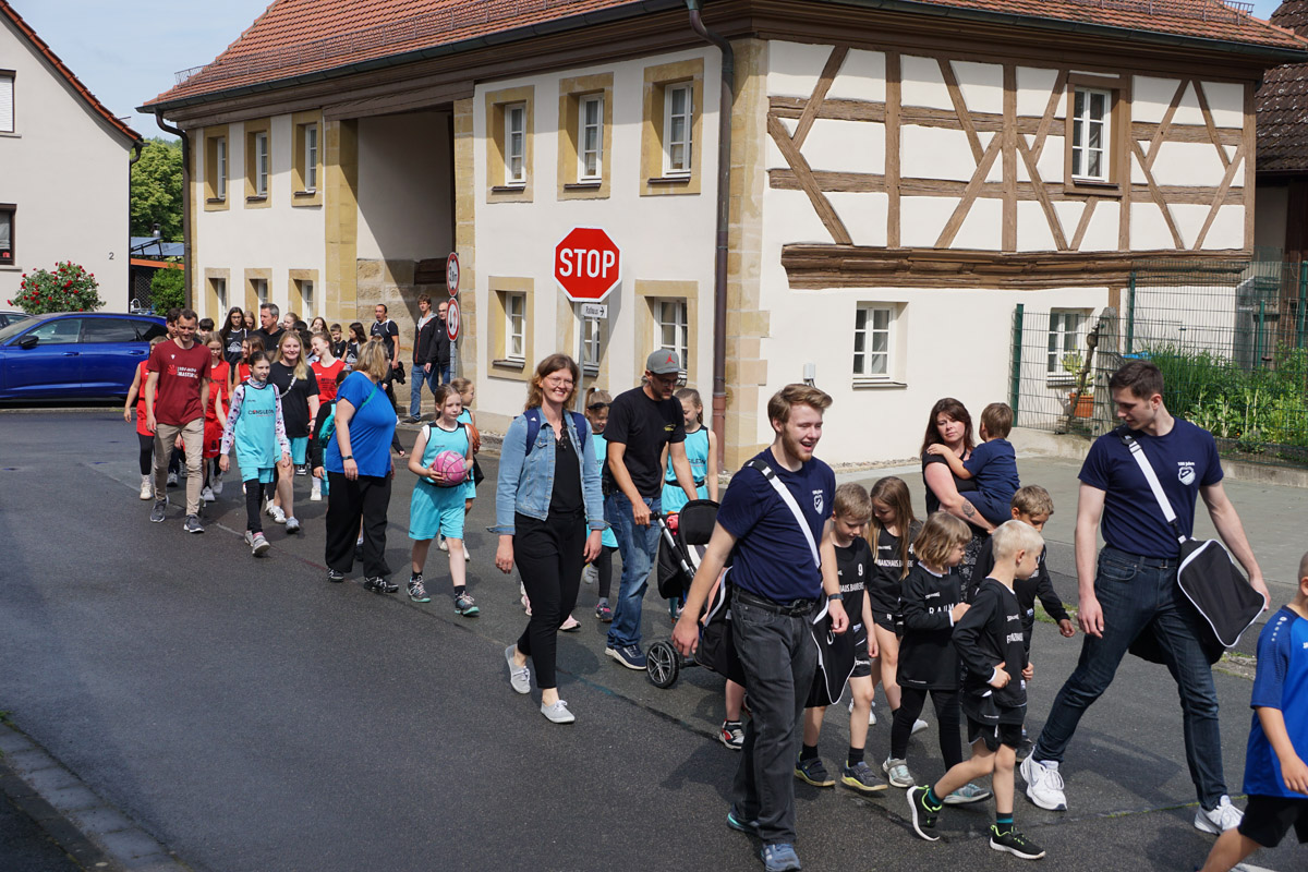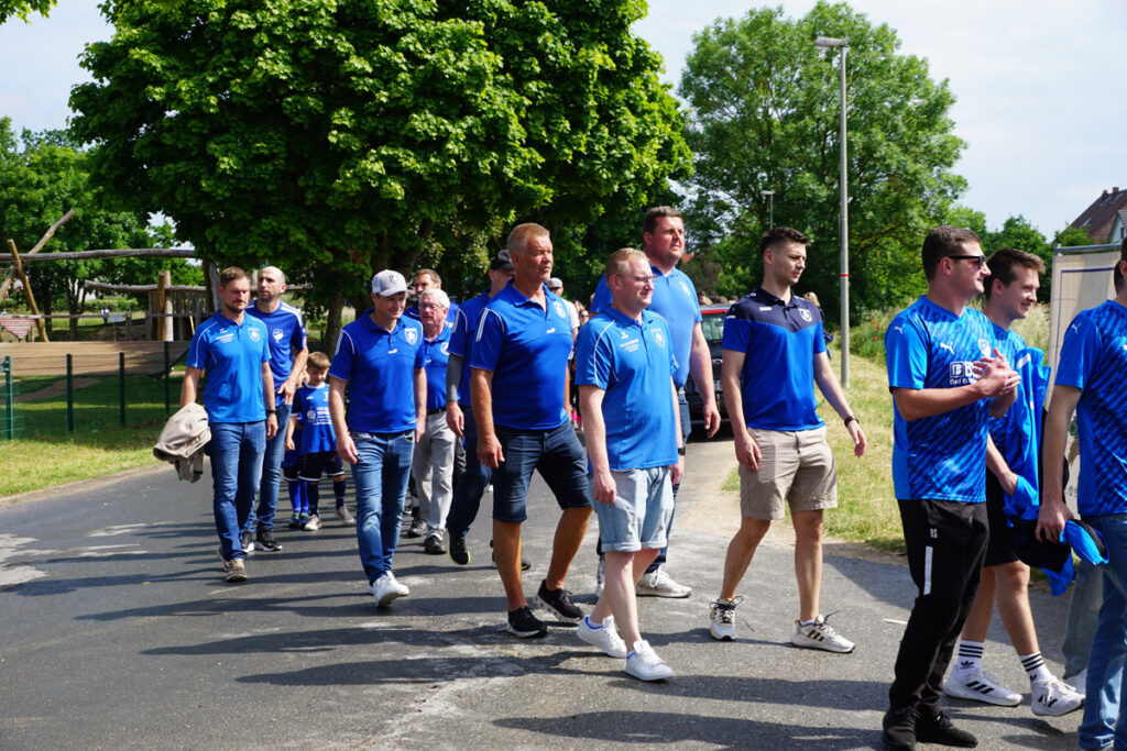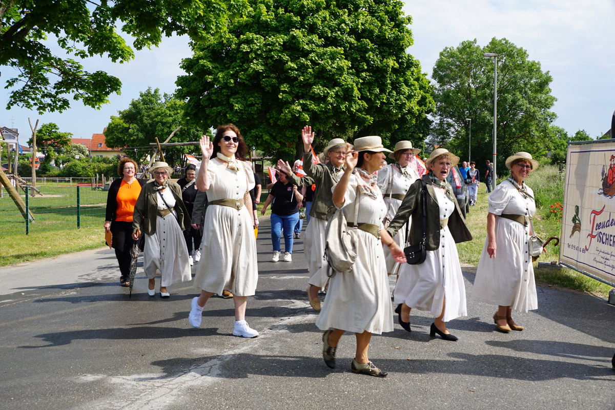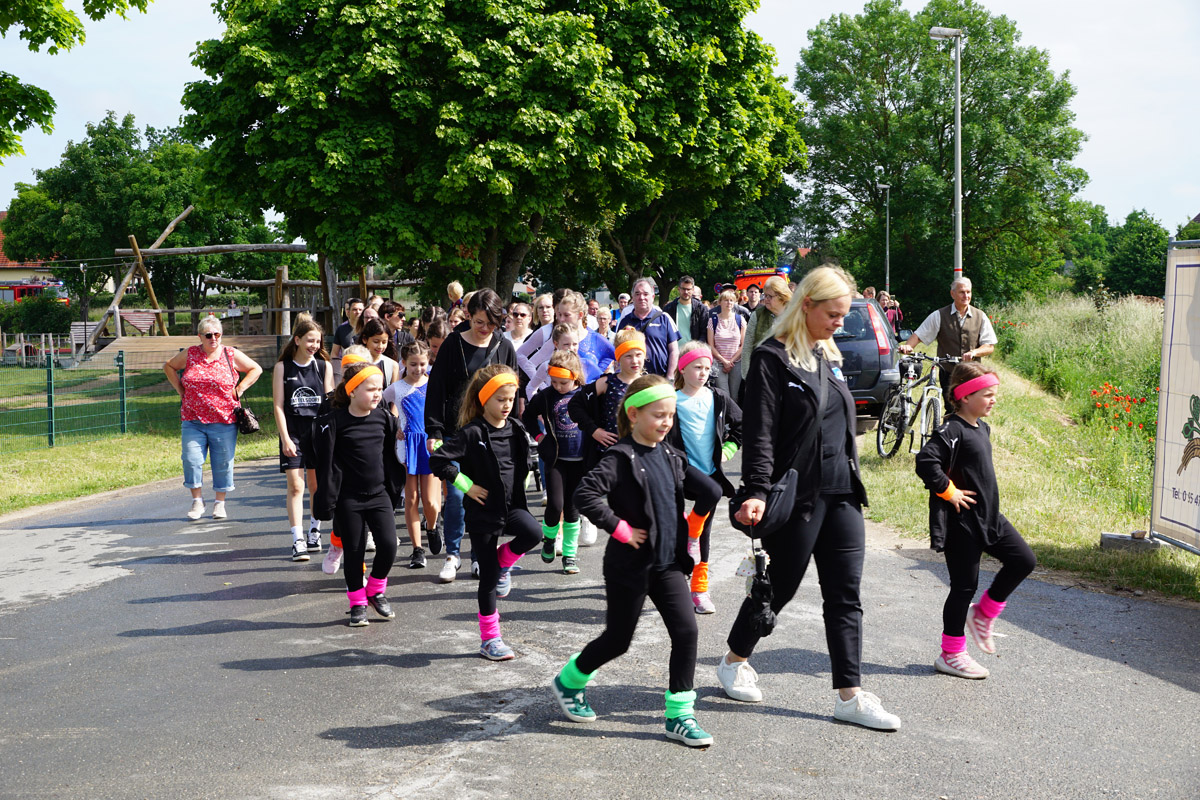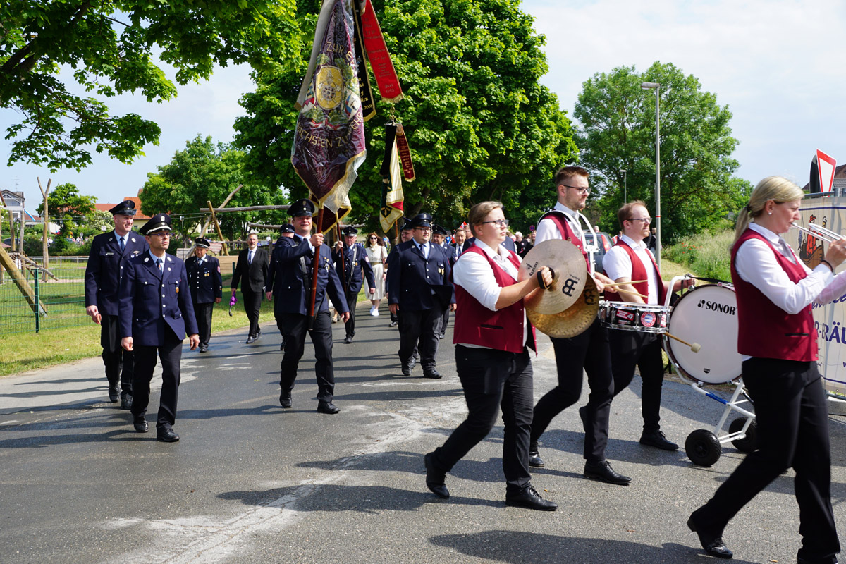 Kurz vor dem Start des Festumzugs nach dem Gottesdienst sagte der leichte Regen „Auf Wiedersehen“ – und die zahlreichen Teilnehmerinnen und Teilnehmer konnten trockenen Fußes von der Kirche durchs Torhaus bis zum Sportplatz laufen.