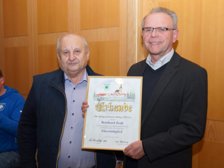 Emil Schneiderbanger, Ehrenamtsbeauftragter der SpVgg Germania Ebing, blickte zurück. 26 Jahre lang war Bernhard Zenk an führender Stelle im Verein tätig, zwei Zeitspannen als erster Vorstand (1980 bis 1984 und 2003 bis 2018). Er war auch schon Schriftführer und zweiter Vorstand. „Viele große Dinge wurden in Deiner Amtszeit angepackt: Die Sanierung des Sportheims, die Instandsetzung des Hauptspielfeldes, der Bau der Photovoltaikanlage als sichere Einnahmequelle, den Anbau des Geräteraums und eine neue Bewässerungspumpe“, so Schneiderbanger. Und natürlich sei der Sport nie zu kurz gekommen, Zenk habe sich für den Frauenfußball genauso eingesetzt wie für die anderen Mannschaften, was 2011 mit dem Aufstieg in die Bezirksoberliga gipfelte, die dann aber aufgelöst wurde. Keine Frage sei es daher gewesen, Zenk zum Ehrenmitglied zu machen, die Urkunde überreichte er gleich im Rahmen der Mitgliederversammlung am 26. Februar 2018.