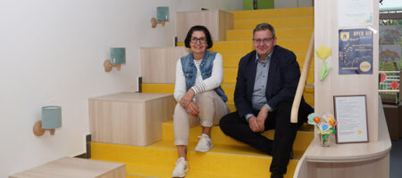 Zurück ging es im November 2023 – in neue, helle Räume, die einige Besonderheiten mitbringen. Sie sind alle von außen begehbar, inklusive des Multifunktionsraums (ehemalige Schulturnhalle). Und es gibt endlich ein Büro für die Kindergartenleitung, vorher musste in einem nur rudimentär abgetrennten Bereich in der Küche gearbeitet werden. Zudem wurde es ein kleines Kinderrestaurant eingerichtet – und ein Spielbereich, der in dieser Form einmalig sein dürfte. Denn der ehemalige Treppenaufgang Richtung Schulhaus wurde zur Hälfte abgebrochen, der untere Teil bietet nun Sitzstufen und Platz zum Spielen. Und bald kann auch der Außenbereich genutzt werden, hier muss aber noch der Rasen richtig anwachsen.