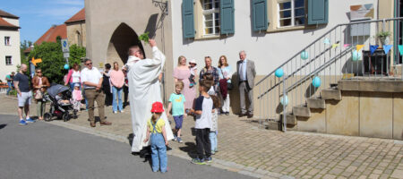 Und wie der Bürgermeister zuvor danke Christina Grünert auch dem Pfarrvikar Philipp Janek, der vor der Weihe der Räumlichkeiten in einem Gottesdienst für die Kleinsten in der Pfarrkirche St. Peter und Paul zwei Kreuze geweiht hatte. Unter dem Motto „Fünf Brote und zwei Fische – 5.000 werden satt“, erinnerte er daran, dass viele Leute Jesus hören wollten, und als sie Hunger hatten, wurde das wenige geteilt und alle wurden satt. Dies sei auch in einer Kindergruppe wichtig, was die mit bewegungsspielerischen Elementen gesungenen Lieder anklingen ließen: „Wie schön, dass Du da bist!“ Sowohl bei der Weihe des Regenbogen-Kreuzes in der Kirche, wie auch des „Mäuseturms“ hatten die Kinder tatkräftig mitgeholfen.