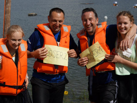 Sechs Teams sind wirklich wenig. Im Vorjahr [6] waren es immerhin noch elf, die beim Ebinger Sautrogrennen im Rahmen des Seefestes gegeneinander antraten. Und so ließ es sich in diesem Jahr Moderator Andreas Eiermann nicht nehmen, selbst wieder in den Trog zu steigen – im Team „Meistertrainer“ mit Matthias Will. Währenddessen übernahm die Moderation besagter Jonas Merzbacher, der einen schnellen Untergang der Meistertrainer vermelden musste und sich daher voll auf die Seite der Gegner, dem Team „Glühwürmchen“, stellte. Und Luisa Eiermann und Jenny Will schlugen sich nicht nur wacker, sondern fuhren einen ungefährdeten Sieg ein. Gleiches galt für das zweite Damenteam „Abicher Football-Princess“, bestehend aus Lisa Lieder und Anna Schneiderbanger. Sie setzten sich im ersten Rennen gegen das Mixed-Team „Babewatch“ (Julia Treubel und Silvan Lukoschek) durch. Merzbacher selbst hatte dagegen mit seinem Teamkollegen Günther Schmelzer keine Chance gegen „Kemmern Ahoi“ (Max Dormann, Yannik Dörnenburg).