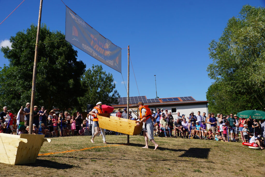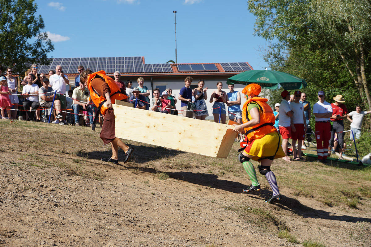 Zwölf Teams traten an, die Startplätze wurden zuvor zugelost. Das bedeutete, dass nicht alle Teams in der ersten Runde antreten mussten, sondern manche direkt ins Viertelfinale vorrückten. Den Reigen der Rennen eröffneten die Vorjahressieger, das Team „Abicher Nachtwächter“ (David Treubel, Leon Kümmelmann). Sie traten gegen die „Spessartbuam 1“ (Benni und Kim) an – und gewannen das Duell gegen die Neulinge deutlich. Apropos Spessartbuam: Gleich vier Teams waren unter diesem Namen mit dabei, angereist als Junggesellenabschied aus der Nähe von Aschaffenburg. Mit dabei: Bräutigam Leon, der im Team „Spessartbuam 2“ selbst mitfuhr und erst im Halbfinale mit seinem Teampartner Fritz ausschied.