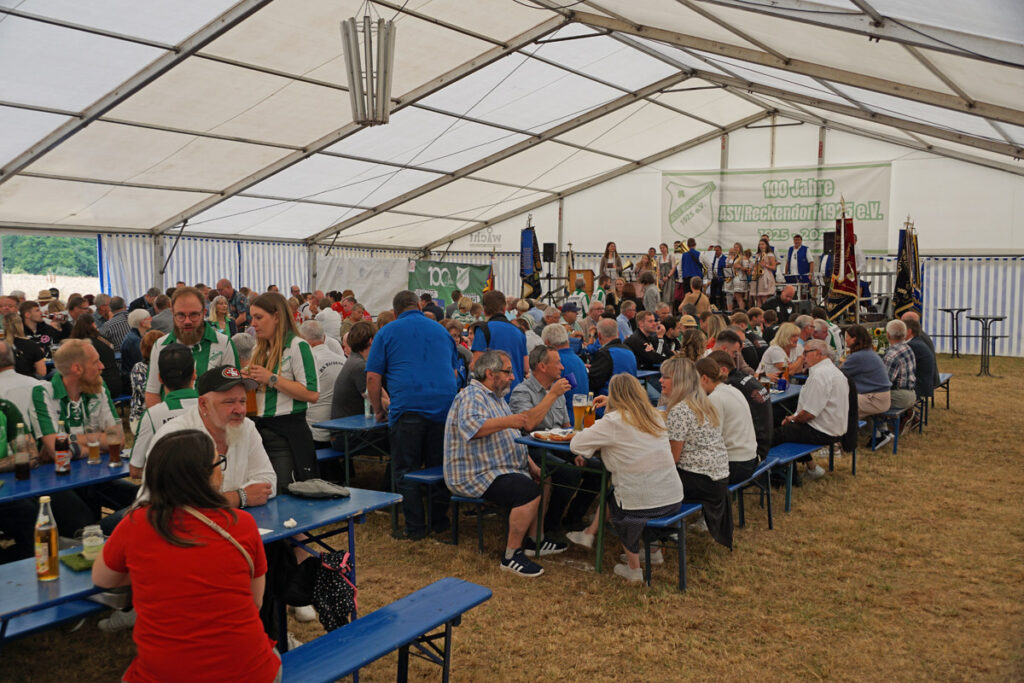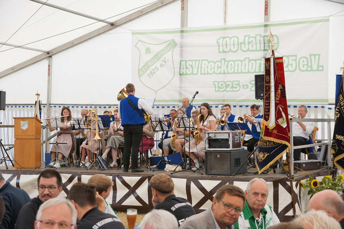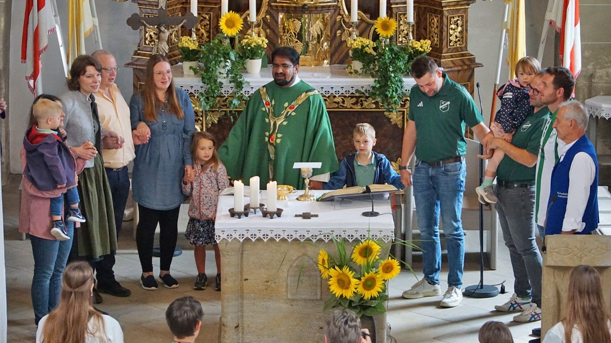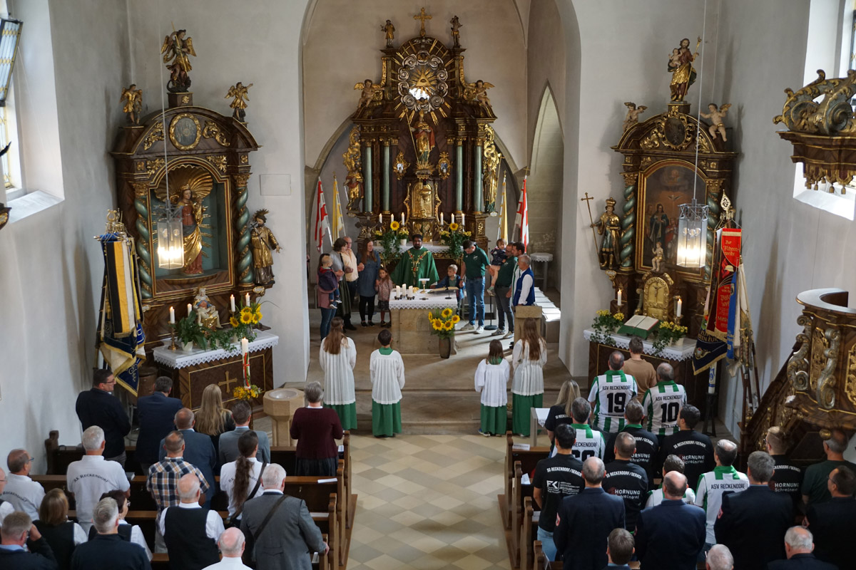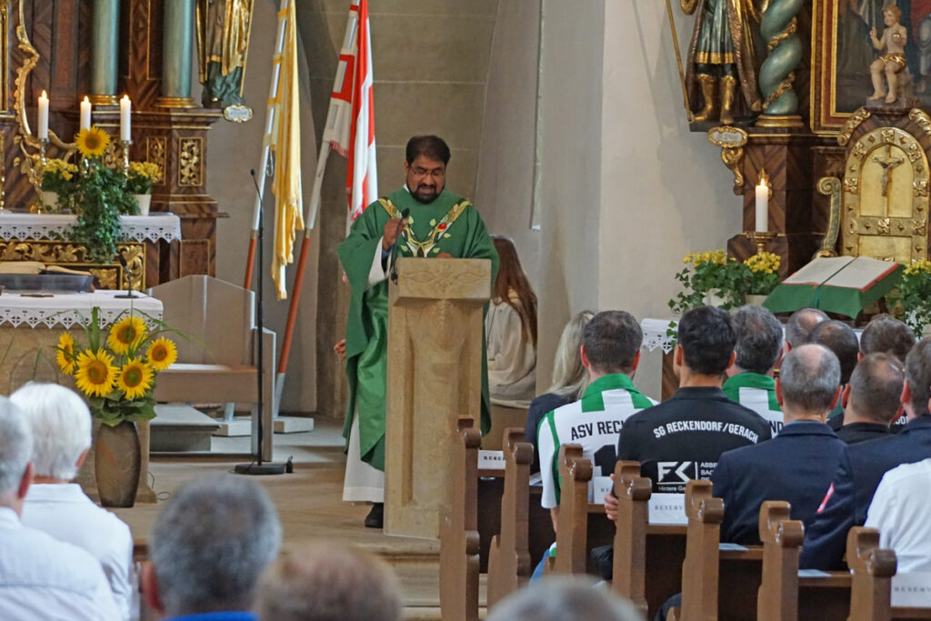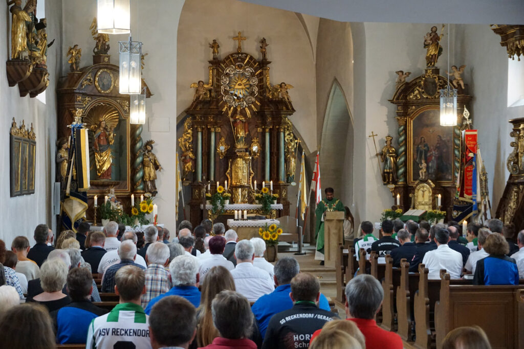 Die Pfarrkirche St. Nikolaus in Reckendorf ist gut besucht, als Pfarrer Vincent Moolan Kurian den Festgottesdienst zum 100-jährigen Jubiläum des ASV Reckendorf zelebriert. Danach führt der Festumzug zum Festzelt neben dem Sportgelände.