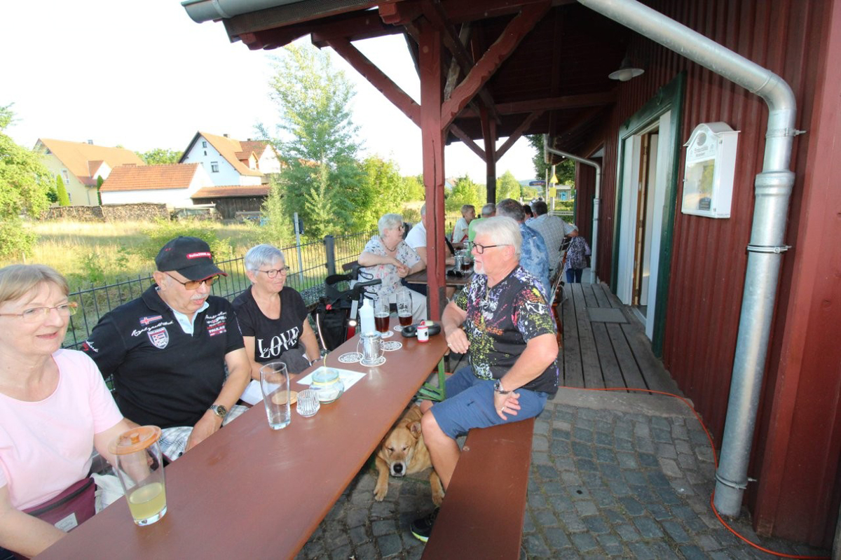 Im ehemaligen Lagerraum befindet sich nun der Ausschank mit Zapfanlage, Stammtisch und der neue Braukessel. Letzterer erhielt als Kleinprojekt finanzielle Unterstützung aus dem Regional-Budget der Baunach-Allianz. Als Kleinod entpuppte sich der ehemalige Warteraum, das neue Nebenzimmer in historisch belassenem Backsteingefache. Doch alle zog es aufgrund der sommerlichen Temperaturen nach draußen.