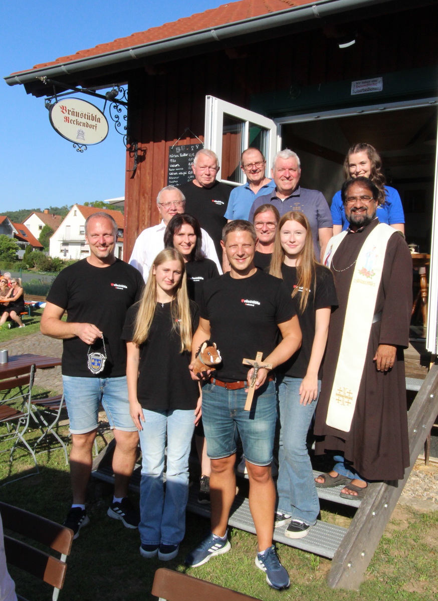 Pfarrherr Vincent zitierte die Paulus-Worte an die Hebräer: „Gottes Liebe soll bleiben. Die Gastfreundschaft vergesst aber nicht; denn durch diese haben einige, ohne es zu ahnen Engel beherbergt“ (Kap. 13, Vers 2). Es folgte die Weihe eines Kreuzes, das den Gastraum von nun an schmücken sollte. Erster Bürgermeister Manfred Deinlein überreichte das Ortswappen zum Aufhängen an einem schönen Platz. Er wünschte gutes Gelingen, nachdem Reckendorf nun im Ranking der Pro-Kopf-Brauerei-Dichte mit drei Brauereien aufgerechnet auf die Einwohnerzahl nach oben geschossen ist.