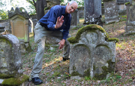 Tom Cohen neben dem Grabstein von Abraham und Mina Kohn, geb. Frankenberger (Nr. 345) mit der Geste der „segnenden Hand“