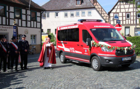 Dekan Stefan Gessner war am 26. Mai 2019 in Reckendorf für den kirchlichen Segen zuständig. Nach dem Festgottesdienst segnete er den neuen Mannschaftstransporter, der zwar schon Ende des vergangenen Jahres geliefert, nun aber offiziell der Freiwilligen Feuerwehr Reckendorf übergeben wurde. Acht Sitzplätze stehen im Transporter zur Verfügung, um die Einsatzkräfte zum den Einsatzorten zu transportieren. Am Besprechungstisch ist ein Funkbedienteil angeordnet, die Ausstattung zur Verkehrsabsicherung sowie zwei Rollwägen zum Transport von zusätzlichem Material hat das Fahrzeug ebenfalls an Bord.