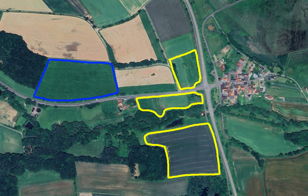 Die gelb markierten Flächen werden nun näher geprüft. Blau umrandet: Hier soll die PV-Anlage stehen. Bild: Google Earth, Montage: Johannes Michel