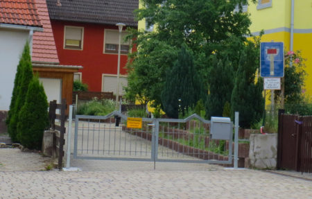 Der seit Sommer 2018 versperrte Ahornweg. Das Verkehrszeichen rechts vom Tor „Sackgasse. Durchfahrt für Fahrzeuge aller Art verboten!“ bezieht sich auf eine straßenverkehrsrechtliche Anordnung des Gemeinderates aus dem Jahr 1954