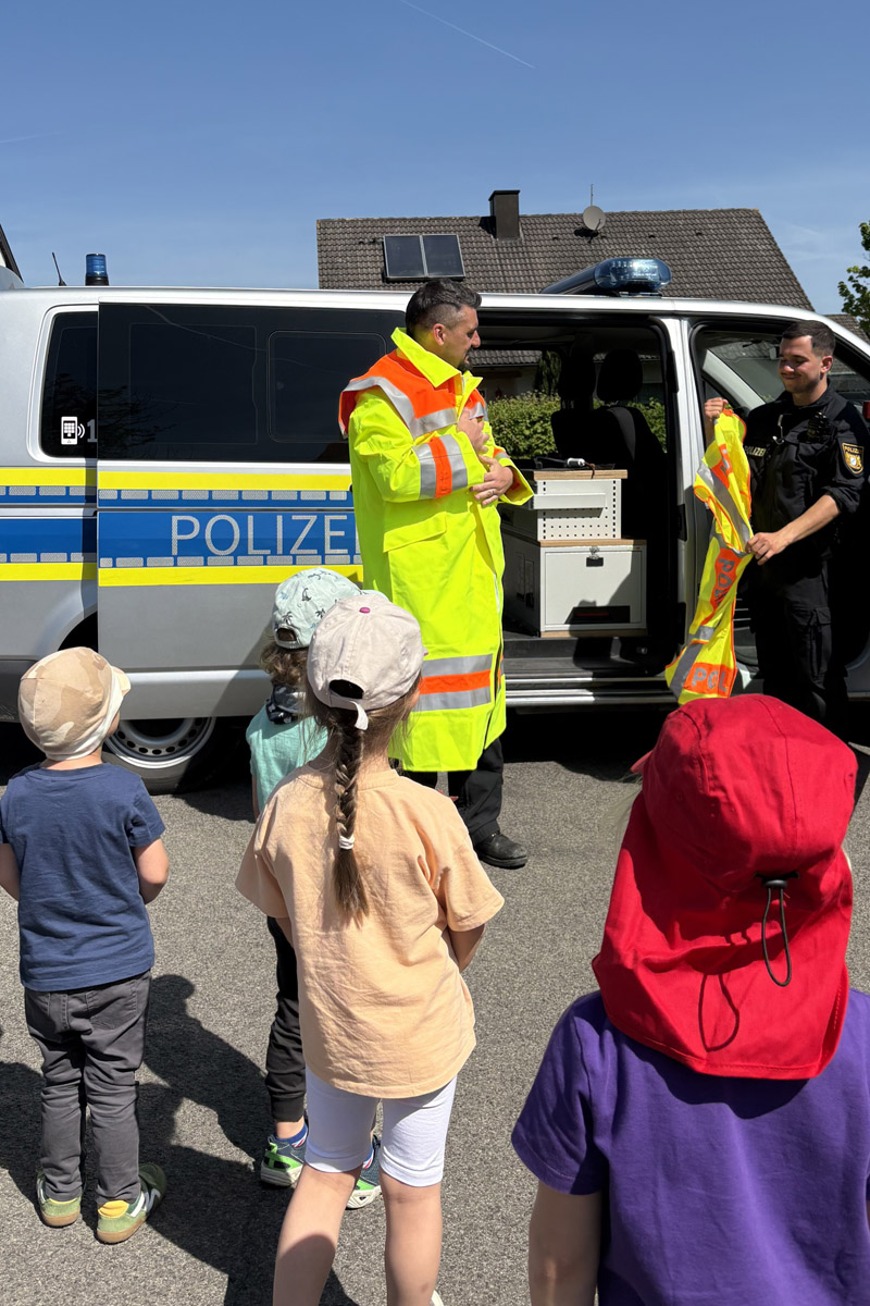 Und es blieb spannend: Die Kinder durften sich das Polizeifahrzeug genauer ansehen und erfuhren alles über die Ausrüstung der Beamtinnen und Beamten. Zum Beispiel die besondere Ausstattung des sogenannten Beweissicherungsteams BeSi, die Beatrice Starklauf vom Kita-Team direkt anprobieren durfte. Ganz schön schwer! Und ganz schön viel, was echte Polizisten so alles an ihrem Körper und an ihrem Gürtel tragen. Wer wollte, durfte dann auch selbst den Warnwestenmantel Probe tragen. Ein bisschen groß für die kleinen Hilfspolizisten, aber ziemlich schick!