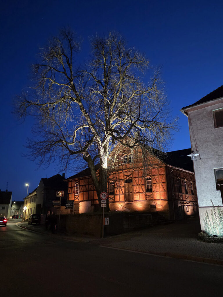Fünf Tage Aufbau. Über zweieinhalb Kilometer Stromkabel, die 100 Leuchten miteinander verbinden. Hinter „Reckendorf leuchtet“ steckt viel mehr, als auf den ersten Blick zu erkennen ist. „Knochenarbeit“, wie Michael Müller im Rahmen seiner Führung betont. Aufgebaut und natürlich getestet wird zu großen Teilen nachts, auch bei Minusgraden und, in diesem Fall glücklicherweise nicht, bei schlechtem Wetter. Dennoch schleppen Müller und die zahlreichen Studentinnen, Studenten und anderen Personen, die am Projekt mitarbeiten, tonnenweise Material durch die Gegend. Und der Muskelkater verrät am Ende, dass echt viel geleistet wurde. Diesmal vielleicht sogar noch ein wenig mehr, denn, so verrät Müller: „Kurz vor dem Start haben wir das Konzept nochmal über den Haufen geworfen.“ Warum? Weil weniger manchmal mehr ist. Denn Licht überstrahlt oft vieles statt zu inszenieren.