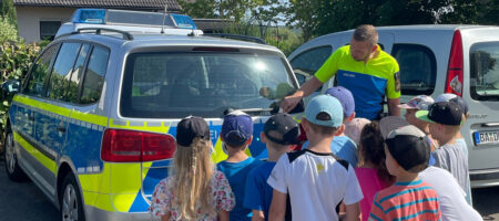 Anschließend wurde das Gelernte dann natürlich auch gleich praktisch ausprobiert. Schließlich werden einige der Kinder als Grundschüler bald alleine zur Schule laufen. Es blieb aber auch genug Zeit, um den Polizeiwagen ganz genau unter die Lupe nehmen und Daniel Geiger alles Wichtige zum Polizeiberuf zu fragen.