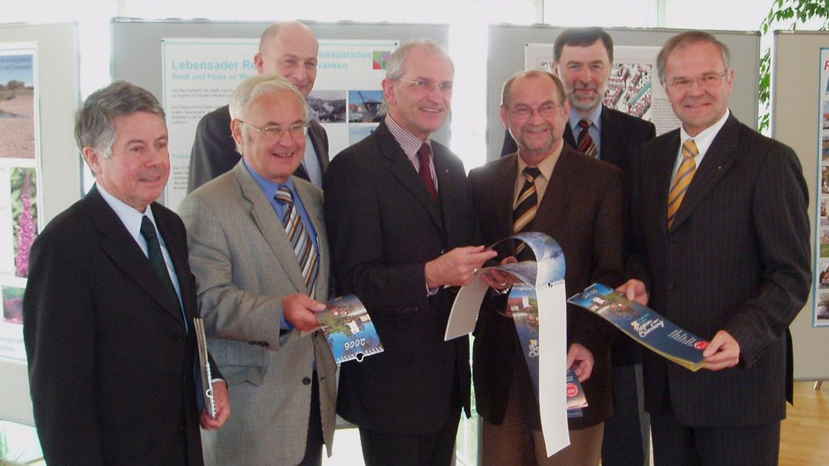 Anlässlich der Gründungsversammlung des Flussparadieses Franken am 21.11.2005 im Landratsamt Bamberg wird der Jahreskalender der Sparkasse mit Flussparadies-Motiven präsentiert vom (v.l.n.r) damaligen Regierungspräsident Hans Angerer (Regierung von Oberfranken), dem damalige Landrat Rudolf Handwerker (Lkr. Haßberge), Bürgermeister Claus Schwarzmann (Markt Eggolsheim), dem damaligen Landrat Dr. Günther Denzler (Lkr. Bamberg), dem damaligen Bürgermeister Werner Hipelius (Stadt Bamberg), dem damaligen Bürgermeister Josef Martin (Markt Zapfendorf) und dem damaligen Sparkassenvorsitzende Konrad Gottschall. (Foto: Landratsamt Bamberg)