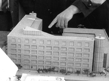 Der damalige Landrat Otto Neukum (rechts) begutachtet gemeinsam mit Kreisräten, darunter Dr. Günther Denzler (damals nicht Kreisrat, Mitte) das Modell des künftigen Landratsamtes.