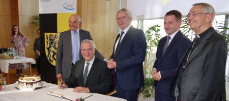 Im Titelbild: Staatsminister Joachim Herrmann trägt sich beim Festakt „50 Jahre Landkreisgebietsreform“ in das goldene Buch des Landkreises Bamberg ein. Mit im Bild (stehend von links): Altlandrat Dr. Günther Denzler, Landrat Johann Kalb, stellvertretender Landrat Johannes Maciejonczyk und Erzbischof Dr. Ludwig Schick.