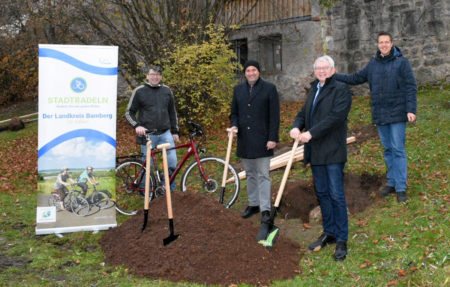 Baumpflanzaktion Stadtradeln von links nach rechts: Josef Körner (Teamkapitän „Stadt Schlüsselfeld / RSV Concordia Elsendorf“), Johannes Krapp (Bürgermeister Schlüsselfeld), Johann Kalb (Landrat des LKR BA), Markus Hammrich (Landratsamt FB 53)