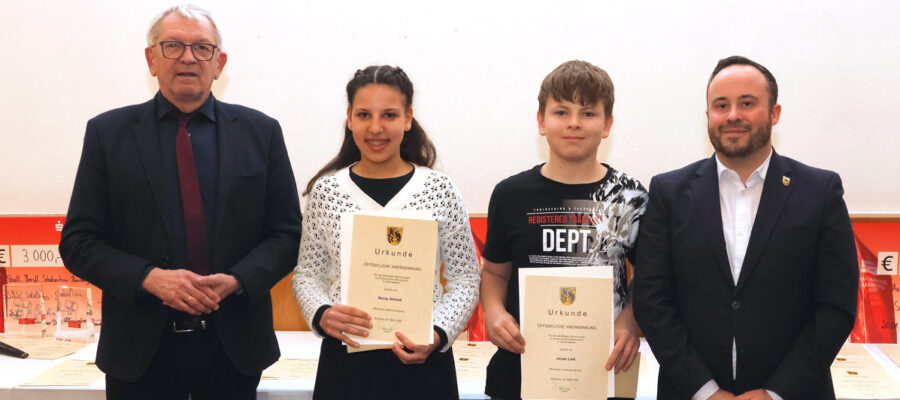Im Titelbild: Landrat Johann Kalb zeichnet Nuray Ahmed und Jonas Link, beide Mitglieder der Jugendfeuerwehr der Freiwilligen Feuerwehr Ebrach, für ihr ihr umsichtiges und entschlossenes Handeln aus. Ebrachs Bürgermeister Daniel Vinzenz schließt sich dem Dank an. (Quelle: Daniel Nagel)