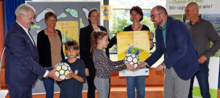 Im Titelbild: Stellv. Landrat Bruno Kellner und Tobias Schenk, Leiter des Klima- und Umweltamtes der Stadt Bamberg übergeben Fairtrade-Fußbälle an Schülerinnen und Schüler der Grundschule Breitengüßbach.