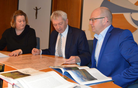 Kreisheimatpflegerin Annette Schäfer, Landrat Johann Kalb und LAG-Manager Jochen Strauß bei der Durchsicht historischer Quellen.