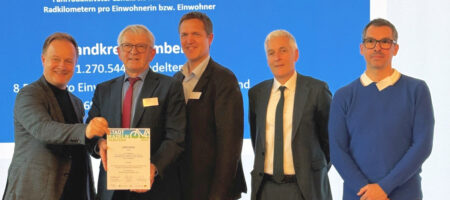 Im Titelbild: Gruppenbild bayernweite STADTRADELN-Abschlussveranstaltung 2025 Kategorie „Fahrradaktivster Landkreis“ (meiste Radkilometer pro einwohnende Person): Landrat Robert Niedergesäß (Landkreis Ebersberg), Landrat Johann Kalb (Landkreis Bamberg), Markus Hammrich (Mobilität, Landkreis Bamberg), Ministerialdirektor Dr. Thomas Gruber, Amtschef des Bayerischen Staatsministeriums für Wohnen, Bau und Verkehr und André Muno (Geschäftsführer Klima-Bündnis Services). Bild: Landratsamt Bamberg/Schellakowsky-Weinsheimer
