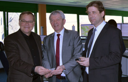 Die Verantwortlichen des Zweckverbandes für Rettungsdienst und Feuerwehralarmierung Bamberg-Forchheim, die Herren Landräte Johann Kalb und Dr. Hermann Ulm sowie Herr Oberbürgermeister Andreas Starke stellen mit den Verantwortlichen der ILS das Warnsystem vor.