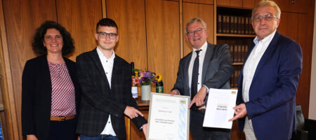 Im Titelbild: (v.l.n.r.) Fachbereichsleiterin Nachhaltige Entwicklung am Landratsamt Bamberg Silke Michel, neuer Öko-Modellregion-Manager Patrick Nastvogel, Landrat Johann Kalb und Lothar Winkler, Behördenleiter des Amtes für ländliche Entwicklung Oberfranken (Quelle: Landratsamt Bamberg / Zeitler)