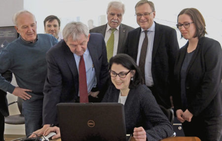 OB Andreas Starke und Landrat Johann Kalb lassen sich von Projektverantwortlichen das neue Pflegeportal erklären.