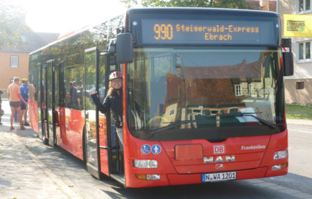 Mit dem „Steigerwald-Express“ erreichen die Fahrgäste direkt den Baumwipfelpfad bei Ebrach oder Attraktionen wie Schloss Weissenstein sowie das Bauernmuseum Bamberger Land in Frensdorf. Der „Steigerwald-Express“ fährt auf zwei Buslinien inklusive Fahrradanhängern zwischen 1. Mai und 1. November immer sonn- und feiertags dreimal täglich. Eine Linie startet am Bahnhof Hirschaid nach Frensdorf und weiter über Burgebrach und Burgwindheim nach Ebrach zum Baumwipfelpfad. Die andere Linie beginnt in Bamberg (Bahnhof), fährt ebenfalls nach Frensdorf und über Pommersfelden nach Schlüsselfeld. Am Linienknoten in Frensdorf wurde der Fahrplan so getaktet, dass ein Umstieg auf die jeweils andere Linie möglich ist. Burgebrach, Burgwindheim, Ebrach, Frensdorf, Pommersfelden und Schlüsselfeld bieten zahlreiche Ausgangspunkte für wunderbare Radtouren in den Flusstälern oder für Wanderungen über die Hügel des Steigerwaldes. Und auch Gaumenfreuden mit süffigem Bier, leckeren Brotzeiten und guter fränkischer Küche erwarten die Radler und Wanderer in vielen Gastwirtschaften entlang der Touren.