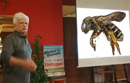 Neben den fehlenden Lückenschlüssen bei Biotopverbünden macht aber vor allem der großflächige Einsatz von Pestiziden den Bienen und Insekten zu schaffen. Zumindest in den Schutzgebieten sollte in Zukunft ein Pestizidverbot durchgesetzt werden. Die Behauptung des Bauernverbandes, Landwirte würden an den Pranger gestellt, wies Herr Mandery zurück. Vielmehr wolle man mit dem Volksbegehren kleinen Landwirten helfen, eine vielfältig strukturierte Nutzlandschaft zu gestalten, die sowohl Belange des Artenschutzes aber auch der Landwirte berücksichtigt. Natürlich müssten Flächen für Biodiversität und Naturschutz dementsprechend gefördert werden.