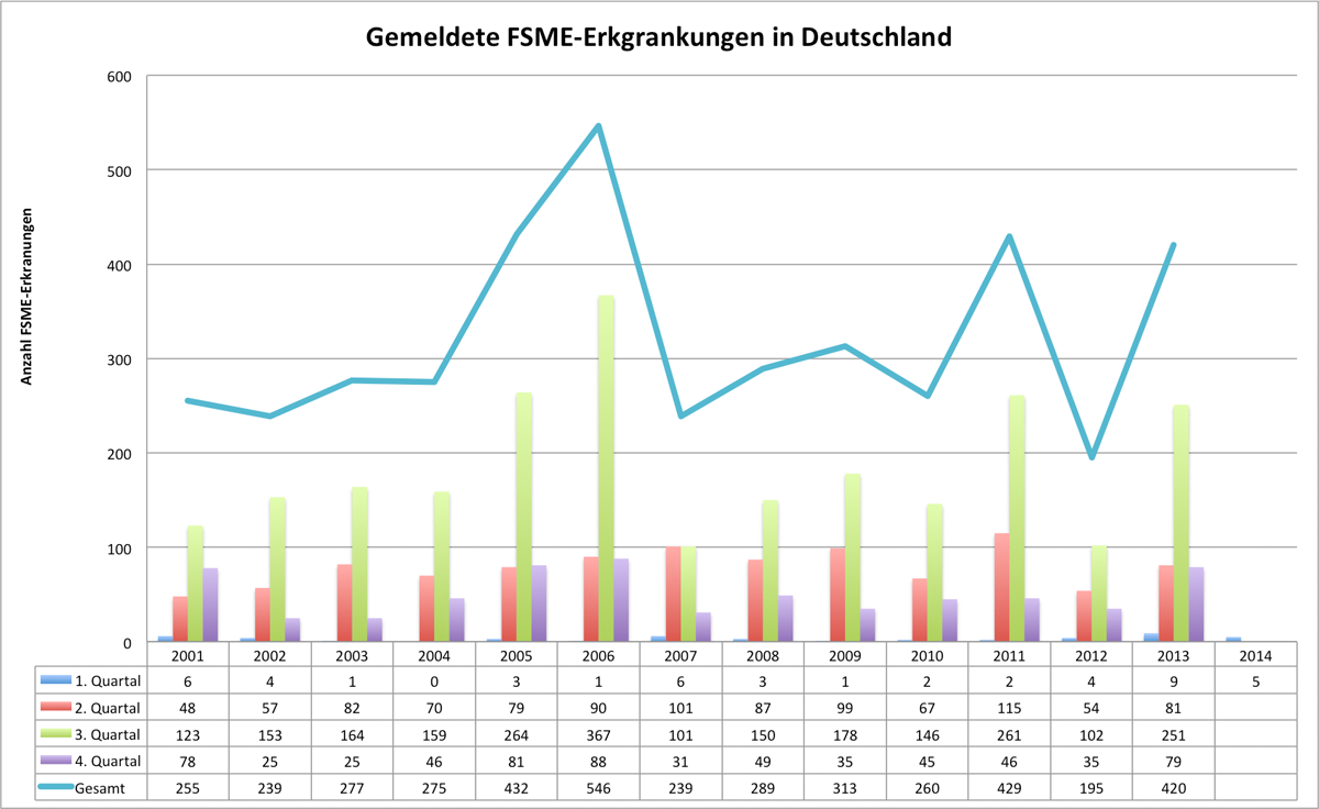 Aus den vom RKI erhobenen Fallzahlen sind starke Schwankungen ablesbar, die unter anderem von unterschiedlichen klimatischen und ökologischen Faktoren abhängen: Nach einem Rückgang der FSME-Erkrankungen auf 195 im Jahr 2012 stieg die Anzahl 2013 wieder auf insgesamt 420 Fälle in Deutschland (davon 175 in Bayern, einer davon im Landkreis Bamberg). Durch die milden Temperaturen rechnen Experten für 2014 mit einem „Rekordjahr“ an FSME-Erkrankungen und sehen sich durch fünf bereits im ersten Jahresviertel gemeldeten FSME-Fälle bestätigt. Im Vergleich der Meldestatistik des RKI über die letzten Jahre (2013: 9 Fälle im 1. Quartal) zeigt sich, dass dies nichts Außergewöhnliches ist. Betrachtet man das Jahr 2006 mit einem Höchstwert an FSME-Erkrankungen von 546 in Deutschland, sieht man, dass dieses 1. Quartal ganz unscheinbar „nur“ einen Fall an FSME verzeichnet.