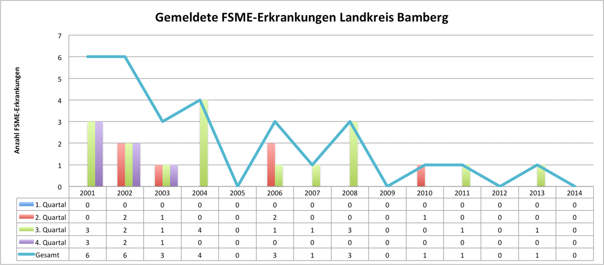 Aus den vom RKI erhobenen Fallzahlen sind starke Schwankungen ablesbar, die unter anderem von unterschiedlichen klimatischen und ökologischen Faktoren abhängen: Nach einem Rückgang der FSME-Erkrankungen auf 195 im Jahr 2012 stieg die Anzahl 2013 wieder auf insgesamt 420 Fälle in Deutschland (davon 175 in Bayern, einer davon im Landkreis Bamberg). Durch die milden Temperaturen rechnen Experten für 2014 mit einem „Rekordjahr“ an FSME-Erkrankungen und sehen sich durch fünf bereits im ersten Jahresviertel gemeldeten FSME-Fälle bestätigt. Im Vergleich der Meldestatistik des RKI über die letzten Jahre (2013: 9 Fälle im 1. Quartal) zeigt sich, dass dies nichts Außergewöhnliches ist. Betrachtet man das Jahr 2006 mit einem Höchstwert an FSME-Erkrankungen von 546 in Deutschland, sieht man, dass dieses 1. Quartal ganz unscheinbar „nur“ einen Fall an FSME verzeichnet.