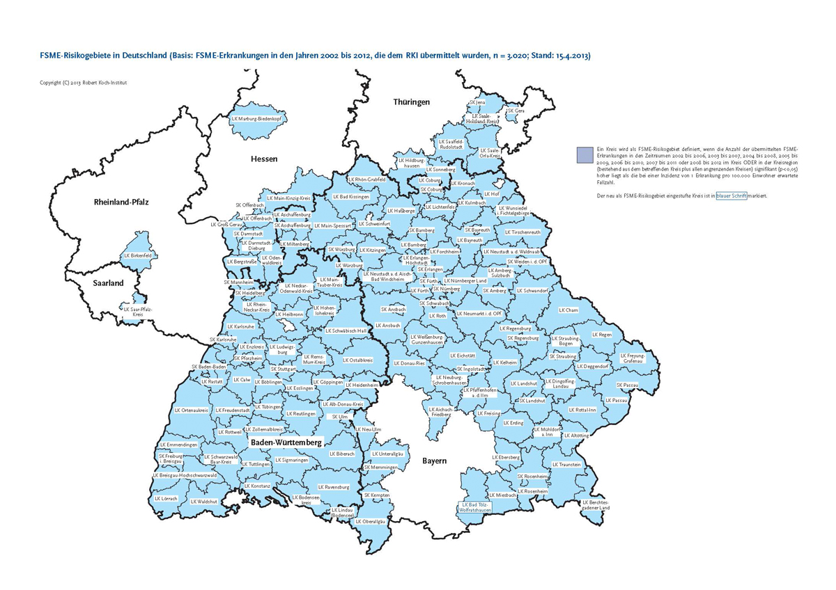 Fest steht auch, dass wir in Bayern in einem FMSE-Risikogebiet wohnen, arbeiten und uns erholen. Die Risikogebiete werden entsprechend der gemeldeten Fallzahlen an FSME-Erkrankungen vom Robert-Koch-Institut (RKI) ausgewiesen.