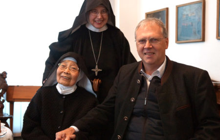 Mit einem Lächeln im Gesicht. So kennen Äbtissin Mechtild Thürmer, ihre Mitschwestern und die zahlreichen Besucher der Abtei Maria Frieden [6] Schwester Humilitas. Am 5. November 2018 konnte sie ihren 85. Geburtstag feiern. In Kirchschletten ist sie schon seit über 50 Jahren.