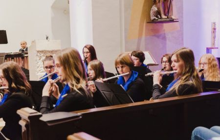 Mit dem Choral „Dum spiro spero“ – zu deutsch „Solange ich atme, hoffe ich“ – von Chris Pilsner schaffte das Orchester unter der Leitung von Daniel Dippold einen Moment der Besinnung. Über schwere und tragende Phrasen, welche dissonant erklangen, sich aber immer wieder auflösten, transportierte jedes Instrument ein Stück Hoffnung in den Zuschauerraum. Mit den weiteren Stücken „A Christmas Carol Fantasy“ (Takashi Hoshide), „Afterlife“ (Rossano Galante) und „Riverdance“ (Bill Whelan) erklangen abwechselnd stimmungsvoll ruhige sowie schwungvolle Passagen. Melodien aus „Der Zauberer von Oz“ (Harold Arlen) und „Kevin allein zuhaus“ (John Williams) brachten mit Sicherheit bei dem ein oder anderen Erinnerungen an vergangene, unbeschwerte Zeiten in der Kindheit hervor. Zwischen den Stücken erzählte Vanessa Car kurze Adventsgeschichten und führte das Publikum mit knappen Textpassagen charmant durch das Konzertprogramm.
