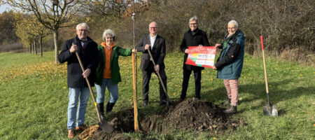 Im Titelbild: Baumpflanzaktion und Spendenübergabe durch die Sparkasse Bamberg (v. l.): Vorsitzender des Kreisverbandes für Gartenbau und Landespflege Bamberg, Landrat Johann Kalb, Kreisfachberaterin Alexandra Klemisch, Vorstandsvorsitzender der Sparkasse Bamberg, Stephan Kirchner, Mathias Polz, Sparkasse Bamberg, Kreisfachberaterin Claudia Kühnel. (Quelle: Landratsamt Bamberg/Bartl)