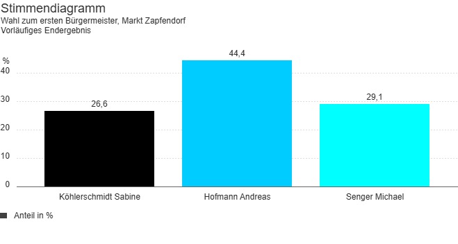 Die meisten Stimmen erhielt Andreas Hofmann (Zukunft Zapfendorf, ZuZ) mit 44,4 Prozent (1.362 Stimmen), gefolgt von Bürgermeister Michael Senger (Wählergemeinschaft Sassendorf) mit 29,1 Prozent (892 Stimmen). Sabine Köhlerschmidt (CSU) kam auf 26,6 Prozent (816 Stimmen) und scheidet damit aus.