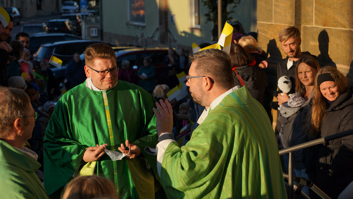 Einen Tag später fand der gleiche Einführungsgottesdienst noch einmal im benachbarten Rattelsdorf in der Pfarrkirche St. Peter und Paul statt. Hier bekam Pfarrer Schürrer die Kirchenschlüssel von Kirchenpfleger Manfred Ullrich – und reichte sie auch hier an Janek weiter. Eine gute Zusammenarbeit wünschten sich Bürgermeister Bruno Kellner und der evangelische Pfarrer Kornelius Holmer. Beim sich anschließenden Empfang im Pfarrhof gab es ausreichend Gelegenheit, bei Häppchen und Getränken mit dem neuen Pfarradministrator sowie dem Pfarrvikar anzustoßen und sich für die gemeinsamen Aufgaben zu stärken. Gestaltet wurden beide Gottesdienste von den örtlichen Gesangvereinen, in Zapfendorf wirkte auch der Musikverein beim kleinen Festumzug mit.