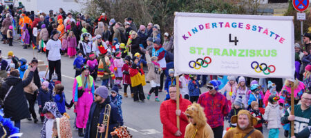 Auf einem Podest an der Kreuzung begrüßten die Moderatoren Kirstin Hoh und Thomas Köhlerschmidt die Wagen und Fußgruppen. Die Kindertagesstätte St. Franziskus präsentierte sich sportlich, es ist ja auch gerade Olympia. „Heute sind wir sportlich, schlau und fit – die Kita macht bei Olympia mit“, lautete das Motto. Auch die Kita St. Christophorus war dabei, sie feiert in diesem Jahr ihr 30-jähriges Bestehen. Musikalisch begleitet wurde die Spitze des Umzugs vom Musikverein Zapfendorf, die Musikerinnen und Musiker waren verkleidet als Tiere aus „Der König der Löwen“.