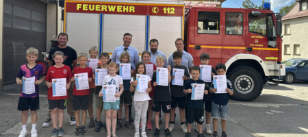 David Saridžić, der Vorsitzende der Freiwilligen Feuerwehr Zapfendorf, konnte da nur staunen. Er freute sich darüber, mit wieviel Eifer die Kinder bei der Sache waren. Dass jeder die Prüfung letztlich bestehen sollte, war ihm aufgrund der gezeigten Leistungen von vorneherein klar. Und so lobte er die angehenden Feuerwehrfrauen und -männer nach Abschluss aller Aufgaben in den höchsten Tönen. Sein Dank galt den Prüfern sowie Ausbilder Martin Menrath. Letzter überraschte die Kinder nicht nur mit Urkunden und Abzeichen, sondern vor allem auch mit leckerem Eis sowie mit Bratwürsten. Holzer Porzner und Johannes Weber ließen sich zum Abschluss nicht zweimal bitten und drehten mit HLF und LF und den Kids an Bord eine Ehrenrunde durch den Ort.