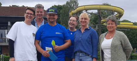 Neben den guten Wünschen durfte Kay sich auch über ein T-Shirt des Fördervereins und eine Kappe freuen – so ist er für die Aufsicht am Becken gut ausgerüstet und hoffentlich stets gut „behütet“. Zusätzlich erhielt er einen Gutschein vom „Eisladen“, ein Fördermitglied der Aquarena-Freunde.
