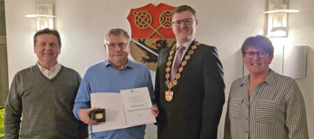 Im Titelbild: Albin Dippold (2.v.l.) mit Drittem Bürgermeister Andreas Schonath, Erstem Bürgermeister Michael Senger und Zweiter Bürgermeisterin Sabine Köhlerschmidt