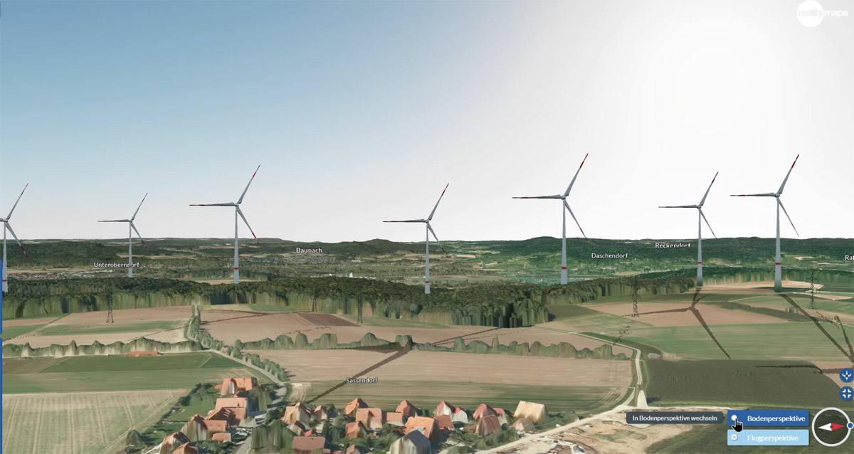 Simulation der Windräder von Sassendorf aus gesehen. Quelle: Bayernatlas / EWmV e.V.