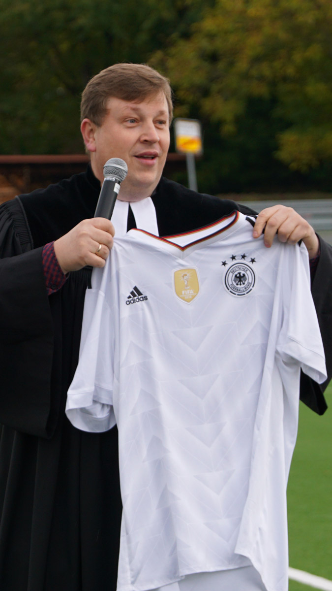 Unsere Kinder waren bei unserem Umzug noch recht jung. Unsere älteste Tochter 14, und die Umstellung war nicht ganz leicht. Aber sie hat sich schnell eingefunden – anfangs hatten wir Schwierigkeiten in der Schule, doch letztlich hat sie es hervorragend gemeistert. Heute ist sie selbst Lehrerin und verheiratet – mit einem Franken. Unser zweites Kind hatte es schulisch auch nicht ganz leicht, aber er hat sich vor allem im Posaunenchor engagiert und in der Konfirmandenarbeit mitgearbeitet. Unser drittes Kind, Paul, macht gerade eine Ausbildung zum Kfz-Mechatroniker. Er ist jetzt 19 und immer noch in der Konfirmandenarbeit aktiv, voll integriert in die Gemeinde und hat eine fränkische Freundin. Unser jüngster Sohn war erst zwei Jahre alt, als wir hierherkamen. Beim ersten Kindergartenbesuch sprach er am zweiten Tag plötzlich fränkisch: „Schau mal, Mama, die Ampel ist g‘freggt!“ Da wussten wir: Jetzt ist er angekommen. Auch ich wurde hier sehr gut aufgenommen – ich erinnere mich noch, wie ich zum ersten Mal ins „Knopfloch“ ging, um Fußball zu schauen. Überall hingen noch Plakate mit unserer Vorstellung, und jemand sagte: „Oh, die Geistlichkeit ist auch schon da.“ Ich war noch gar nicht offiziell eingeführt … Es gibt Kontexte, in denen ich gar nicht als Pfarrer wahrgenommen werden will – da bin ich einfach Kornelius Holmer, Freund, Vater, Nachbar. Aber es gibt auch Momente, in denen es richtig und wichtig ist, dass ich als Pfarrer erkannt werde. Das ist etwas Schönes, weil es zeigt: Die Menschen wissen, wofür ich stehe, und dass ich für sie da bin.