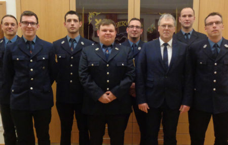 Hintere Reihe von links: KBM Andreas Schnapp, neuer Kassenprüfer Tobias Zenk, KBR Bernhard Ziegmann, bisheriger 1. Vorsitzender Robert Zenk, bisheriger Kassier Georg Rattelsdorfer, bisheriger 1. Kommandant Dietmar Dickert, bisheriger Schriftführer Helmut Hennemann, 1. Bürgermeister Volker Dittrich, neuer Kassenprüfer Markus Kellner, bisheriger Kassenprüfer Erwin Kellner.